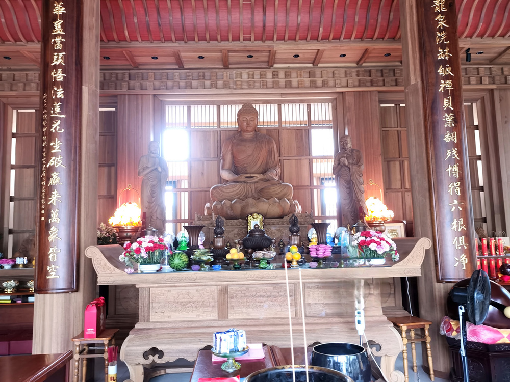 寺内大雄宝殿及佛菩萨像皆由柚木打造,精美庄严,殿内的灯光和墙壁采光设计也非常有特色。