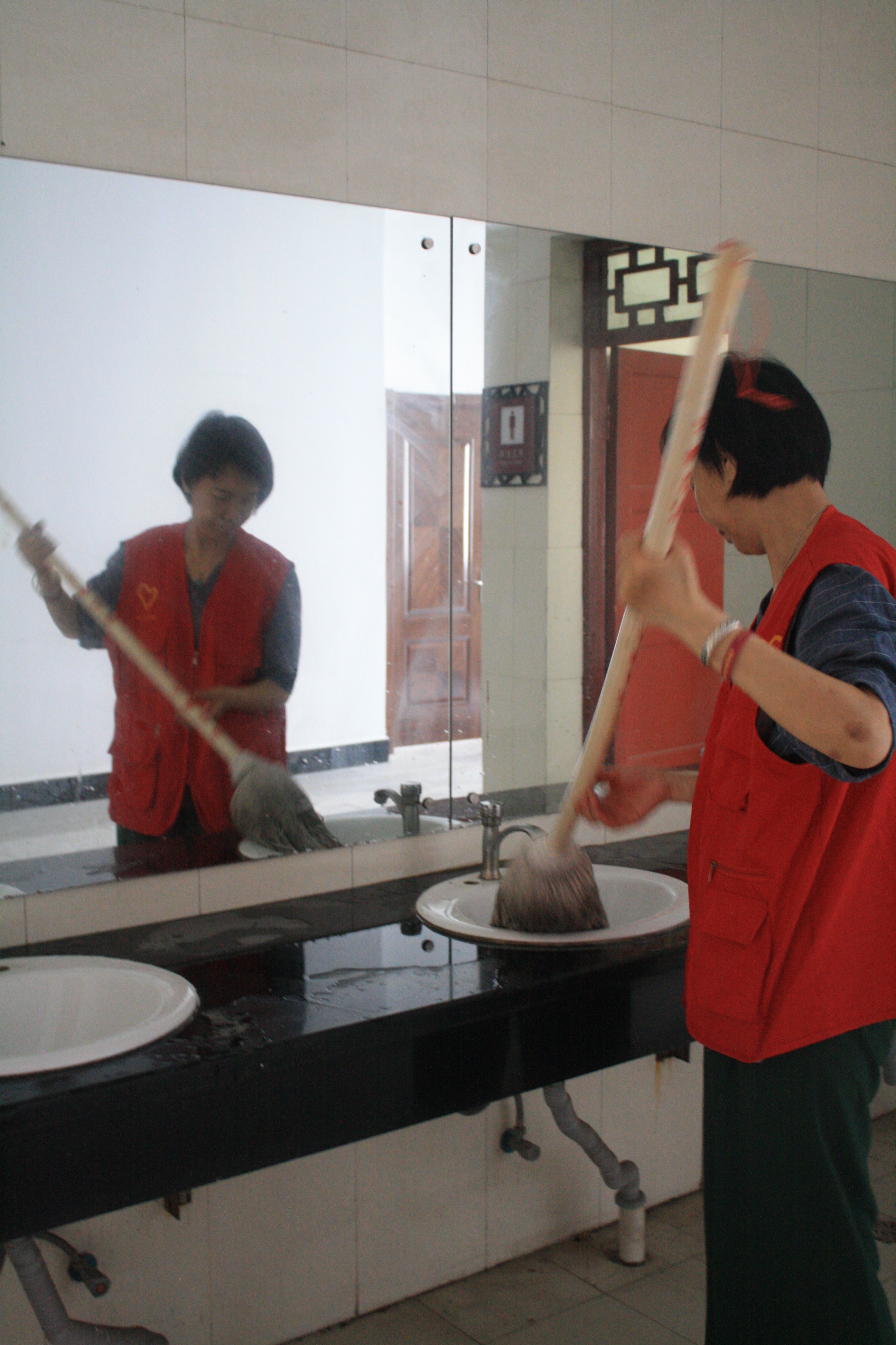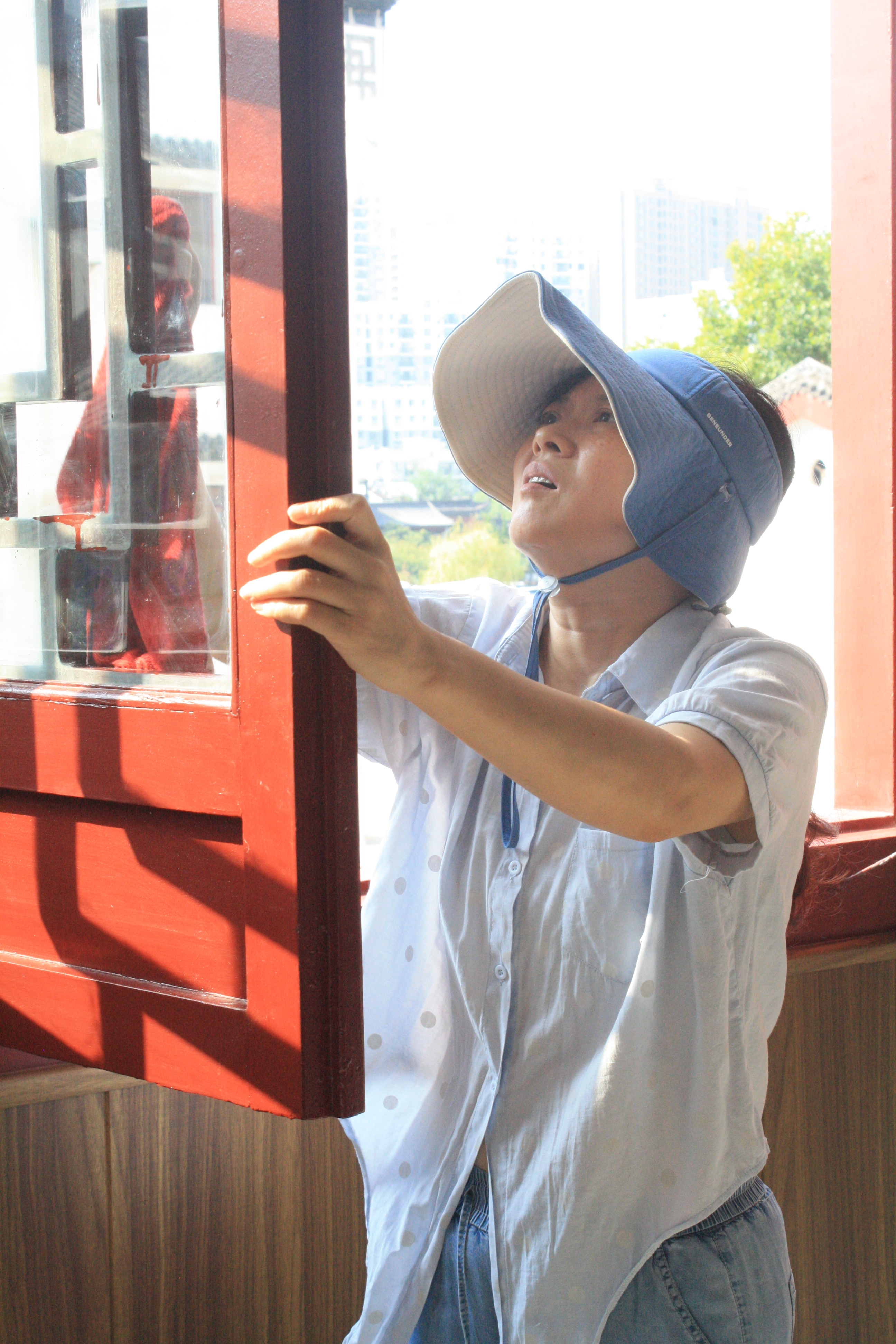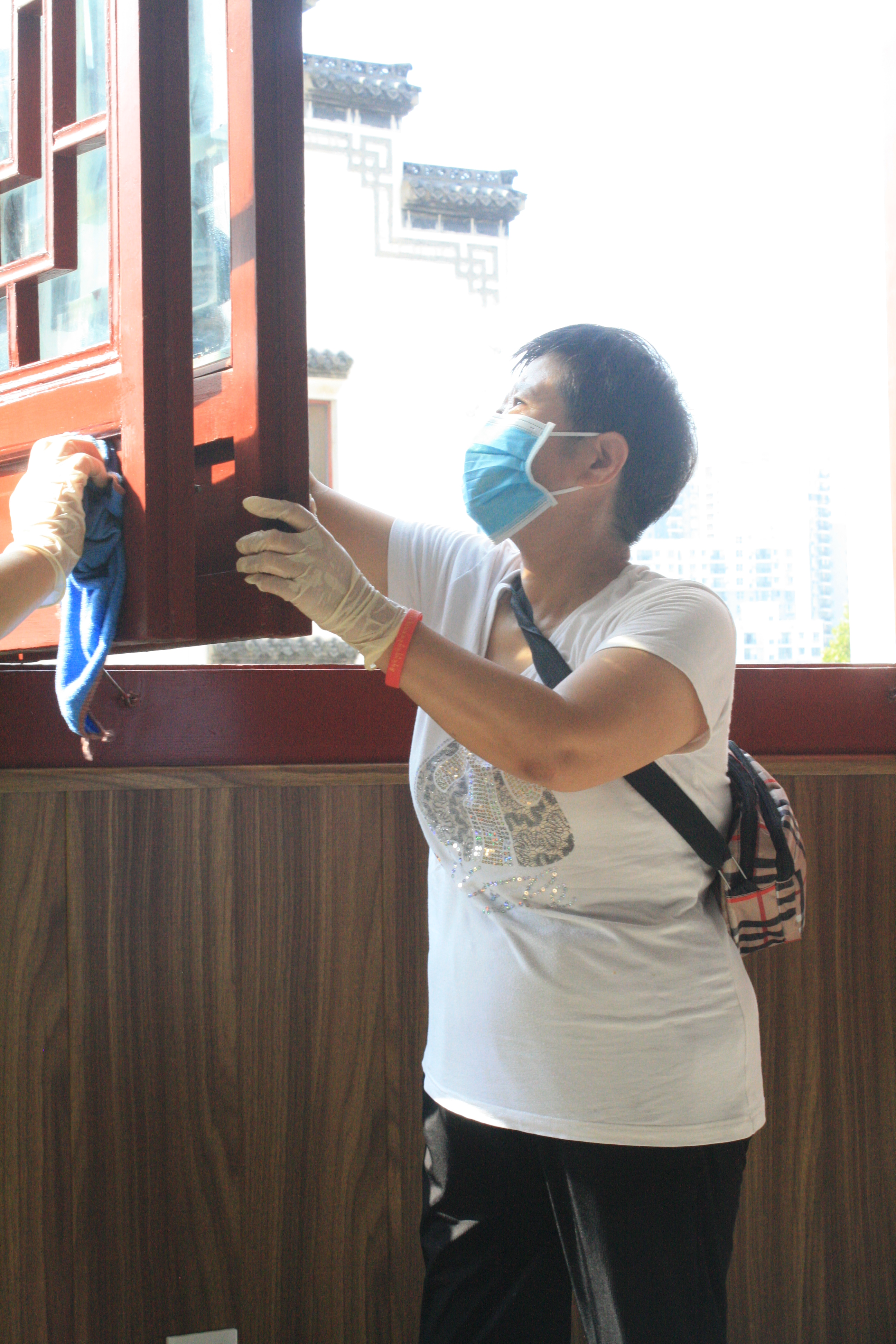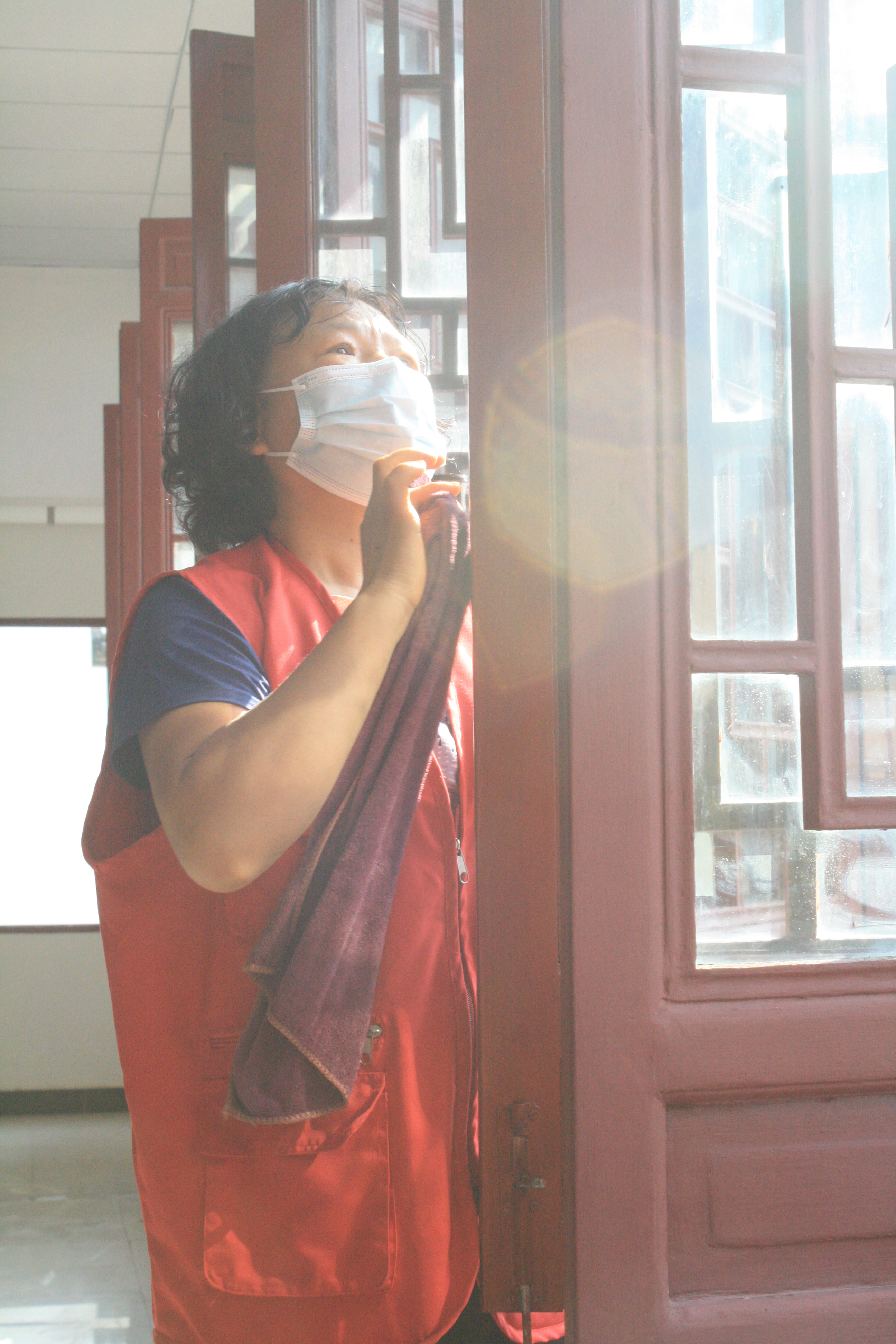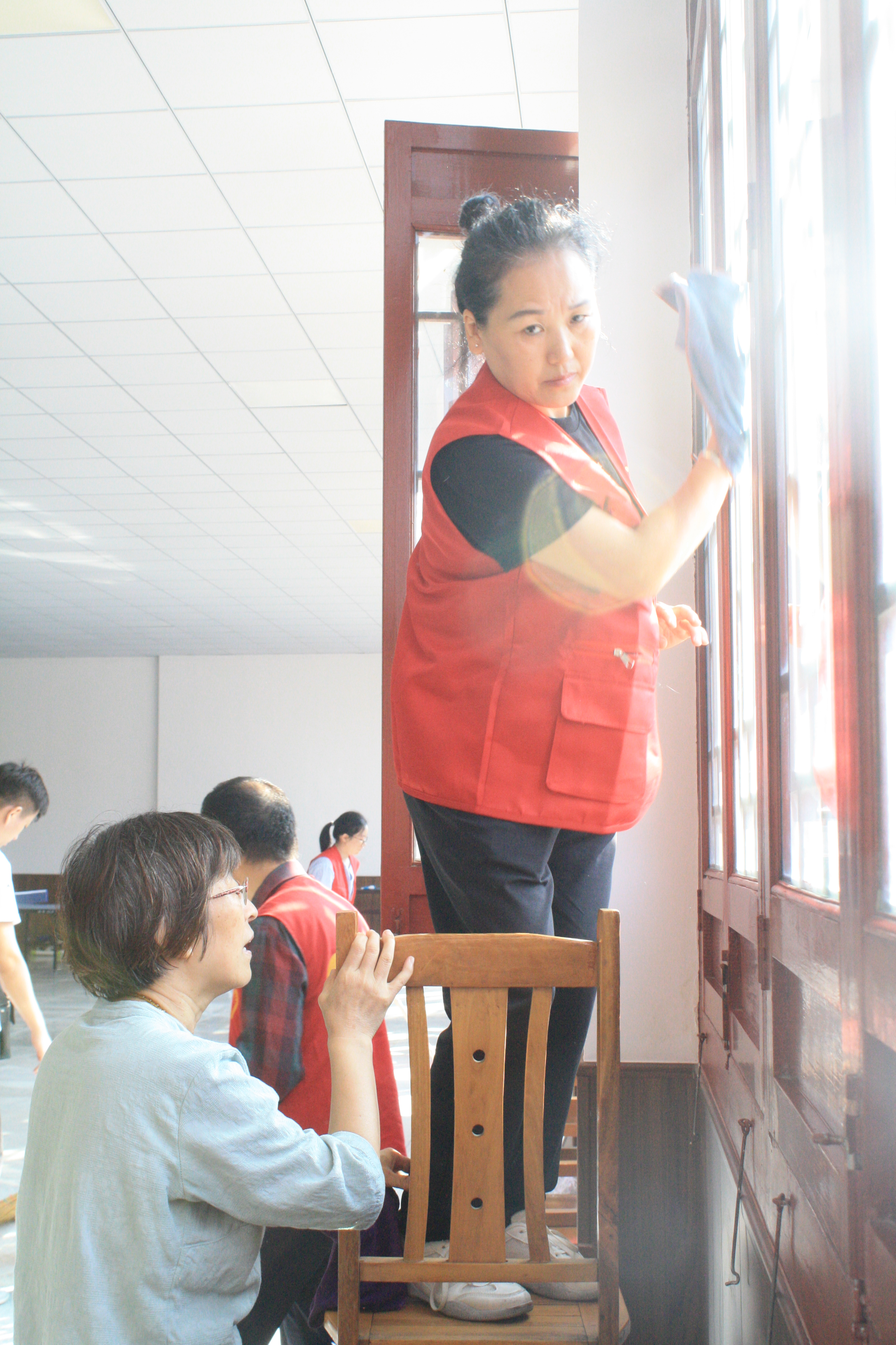 三楼完成了,二楼一时就成了主战场,我充分利用了放置在楼斋堂的几乎全部木椅相拼来当梯子用,用于清洁二楼的窗户这一栋楼的窗户都是那种一面玻璃一面木条拼花格的,这种方式就是特别难以完全做到清洁干净的那种结构,加之确实也许是有些年没有做清洁的,那种成灰形成的污垢,清除起来很是费时费力。