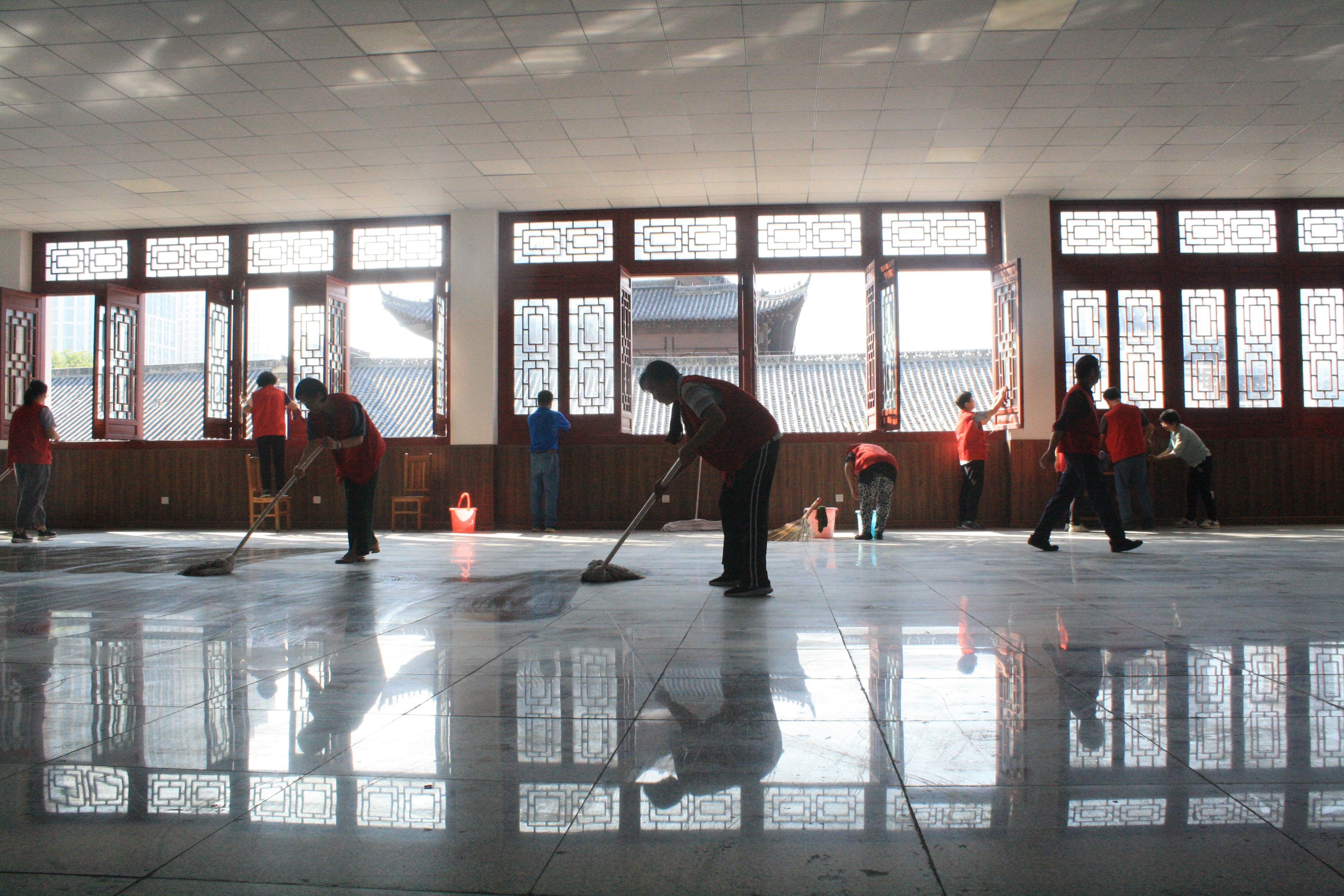 根据任务清单,我们一拨人去到西边的察房收拾房间,一拨人在斋堂,从四楼、三楼到二楼、一楼,一层层的卫生开始做。大寺院的斋堂,于是当然也是相当大的,好在我们的人多且个个专业,所谓所说的专业,那是指人人其实都明了怎么干、从哪开始干、如何干得更好、怎么与其他师兄配合着干等等....先来说吝堂的四楼,好多的房间,所有的被絮、床单等的洗与晒,将零乱的房间进行清整与清洁,虽然说有数台洗衣机却都是五花八门的老式洗衣机,有现在九零后甚至都没见过的、有旋扭脱落无法操作的、甚至还有一台有点漏电的(后即将些事转告给相关负责人了),加之四楼水管出水微细....一时感觉紧迫,初时上来了约有 15 人,我上来一看,这人于不够啊,好在这个时段不停地有师兄陆续地来到归元寺,我也在不停地接电话指引新来的义工如何进来、如何到斋堂来,于是顺便就将刚来的人调配到四楼来补充人手进行支援。三楼层面的事务完成得最快,一是缘于一开始有人数较多的师兄在三楼,二是也仅只地面、窗户需要清洁,其间并无太多杂物。