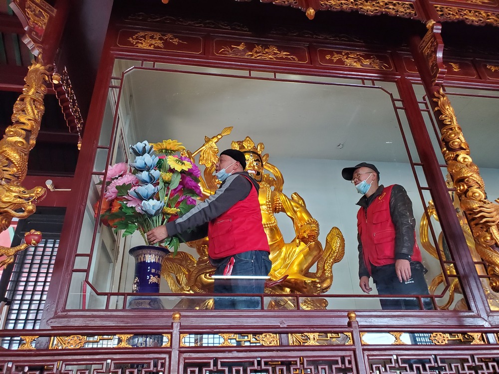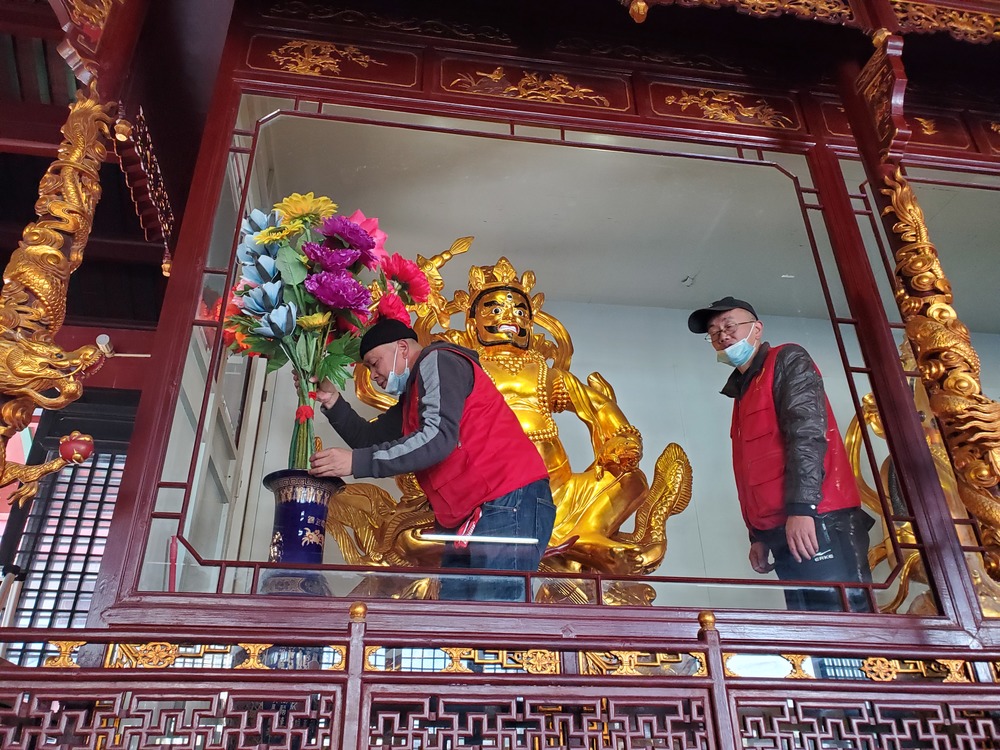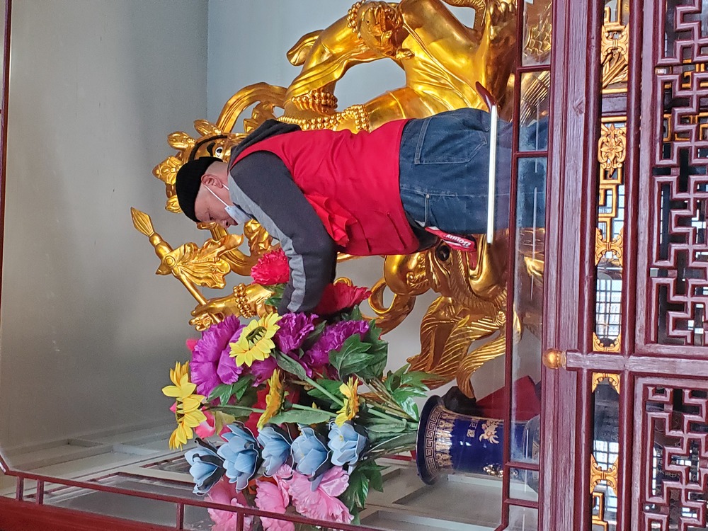 但是日我们来了,我们派出了七位男师兄和数位女师兄去到了财神殿,一上午的时间,真的真的是让该殿焕然一新,金光灿放。