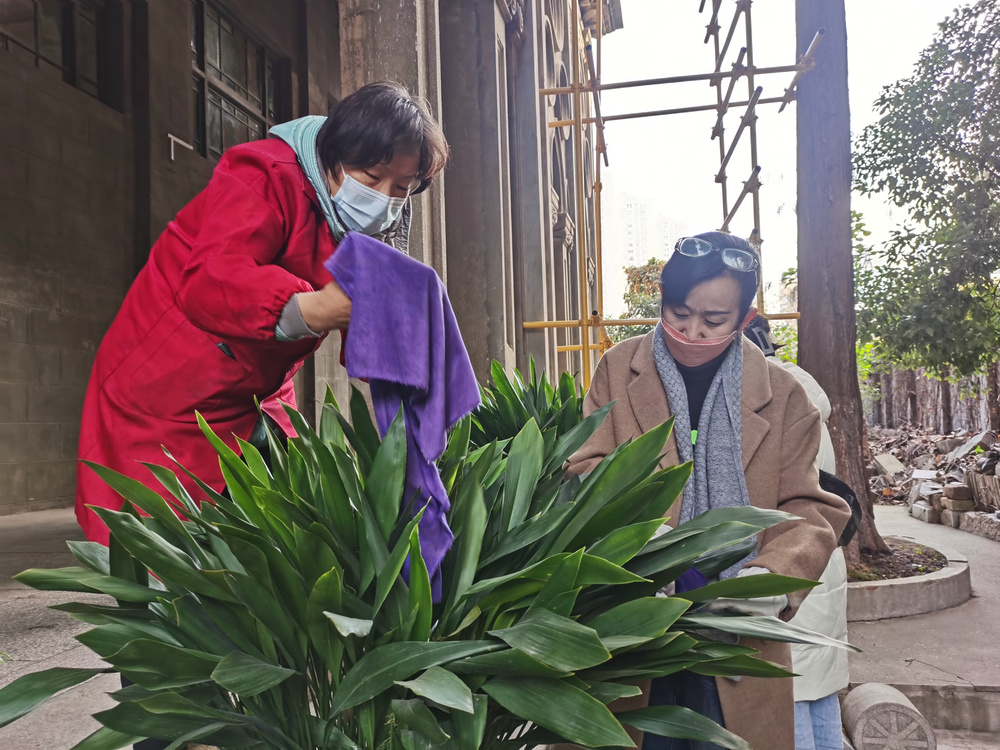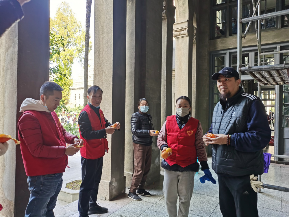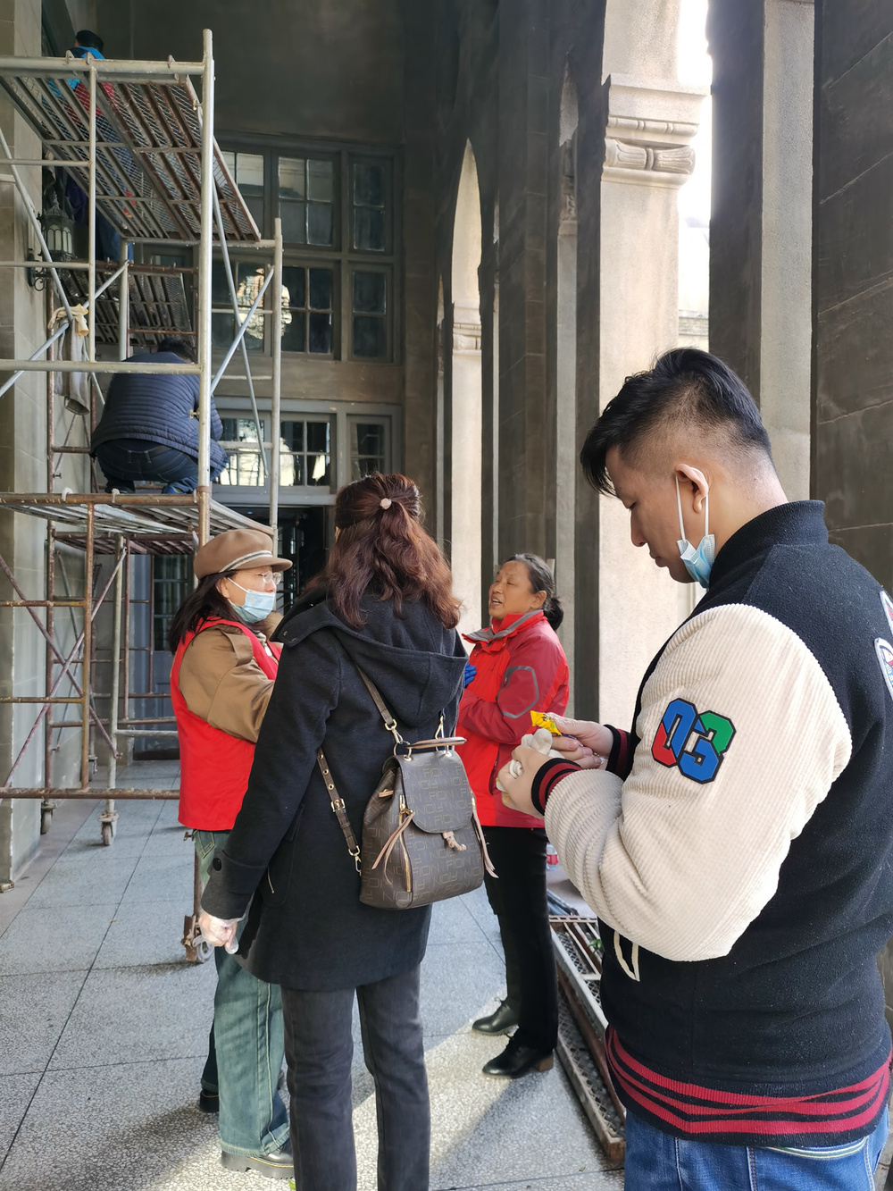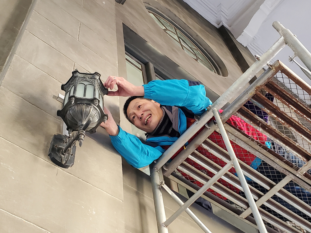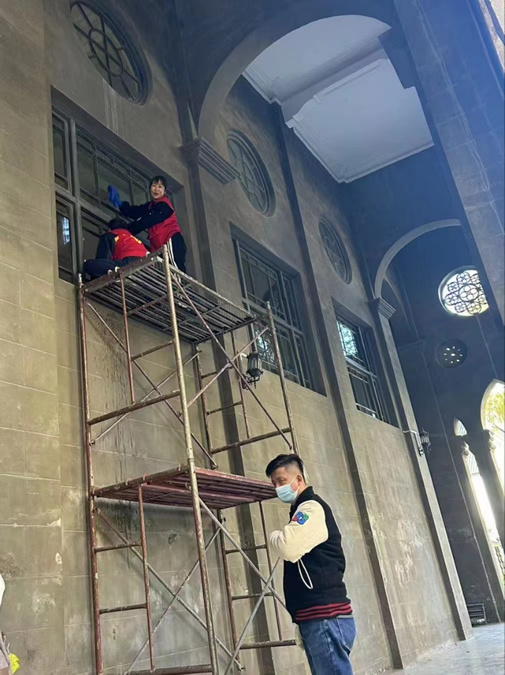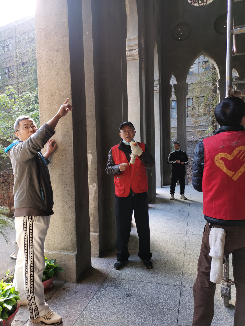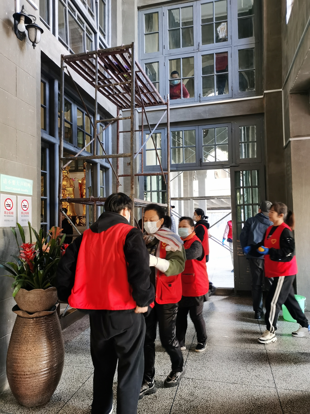 虽然好些擦古德寺高窗的得力干将没有来(比如守望师兄、智宏师兄…)但是我们的作业面开得多呀!我都没太如以前那般上到高处一干一小时不下来,活就快干完了,内心真的是感叹我们义工师兄们团队协作的能量是巨大的啊。