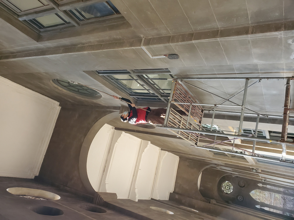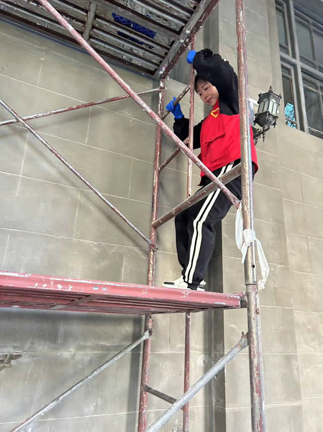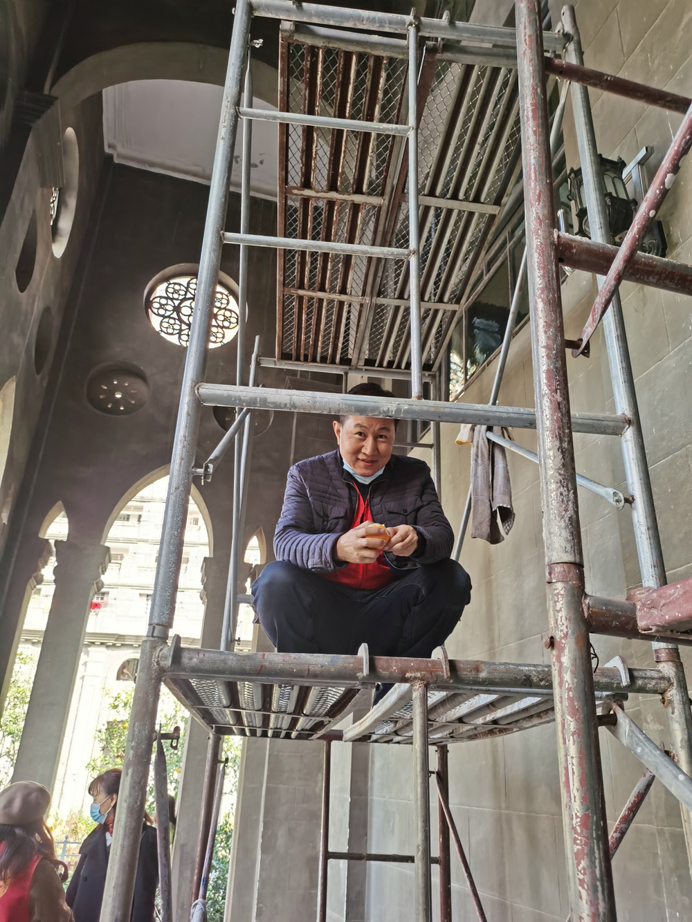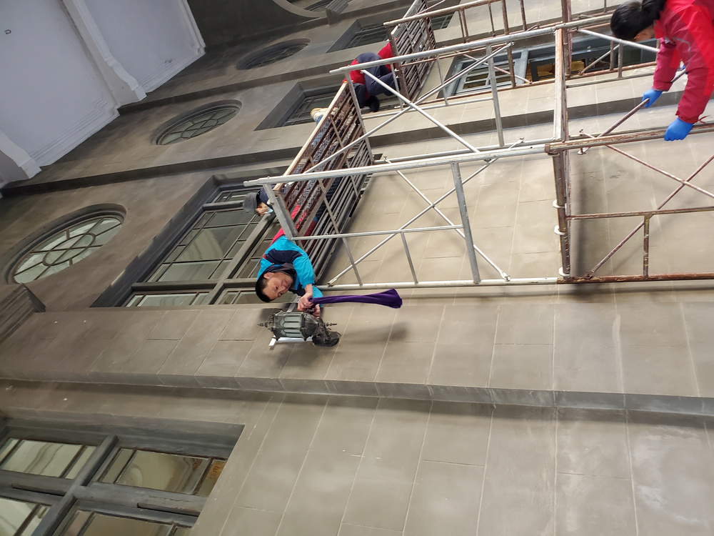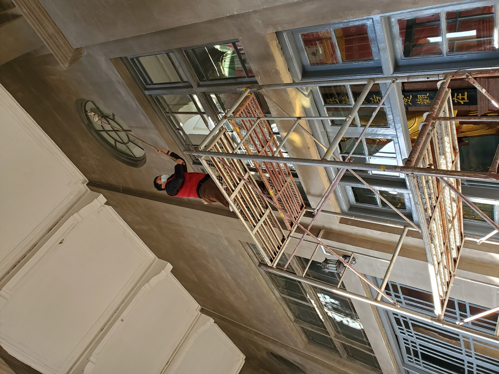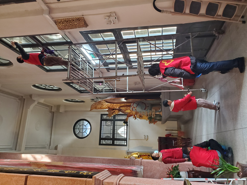 这次因为感觉到任务较重,因此我特意搭建了四处更多的脚手架,开了四五个作业点面。虽然前期搭架子的时间费得多些,但后面的进度表明,一早晨的决定是正确的,到近十一点要过午斋时,大殿周圈的高窗清洁已然完成大半更多的啦!