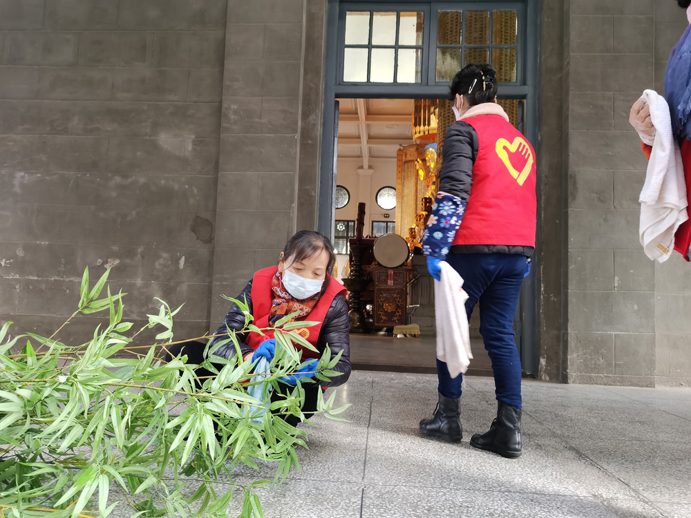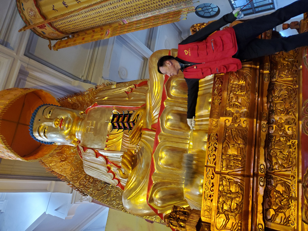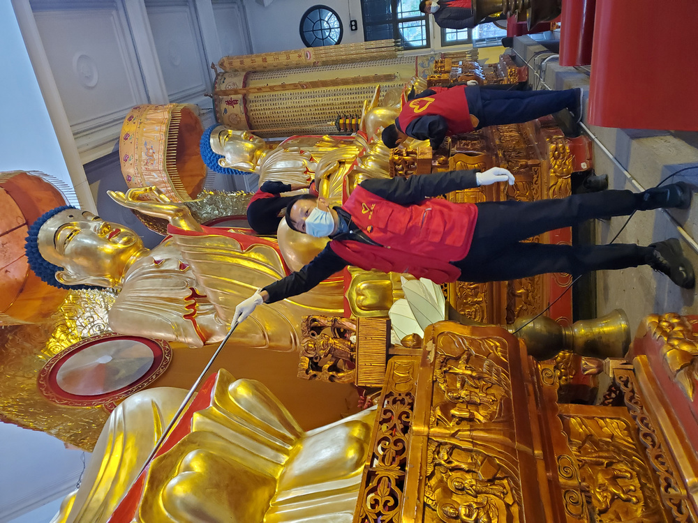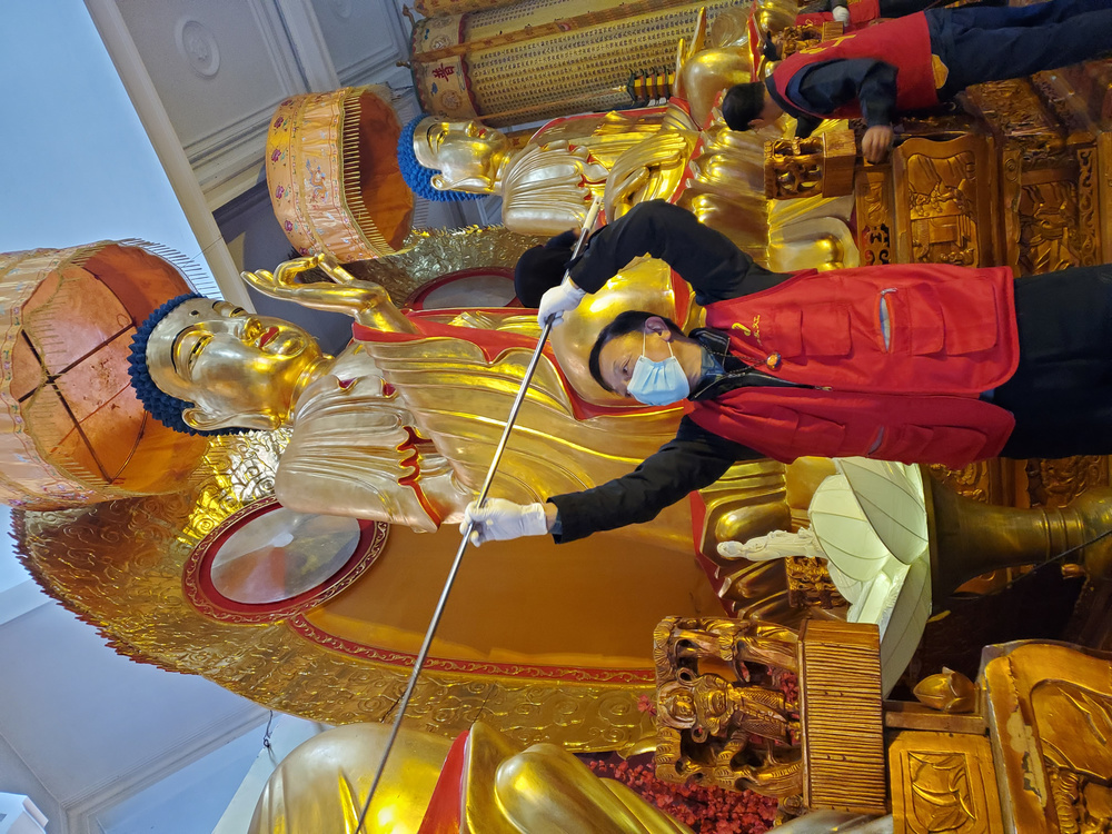 但大殿值殿的寺院义工师兄坚固要求“佛像需男众师兄抹、抹布得用专门的并且只能是干的”