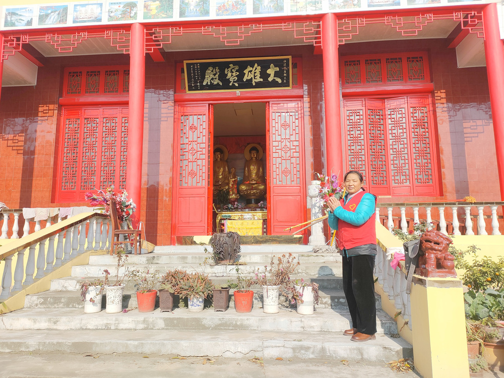 穿越寺庙大门,大雄宝殿以其醒目的大红外墙映入眼帘,师父在大殿前热情接待着我们的到来。