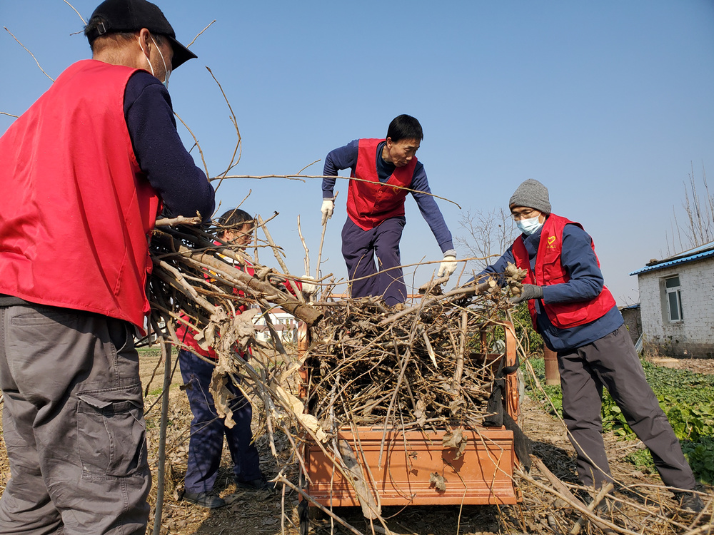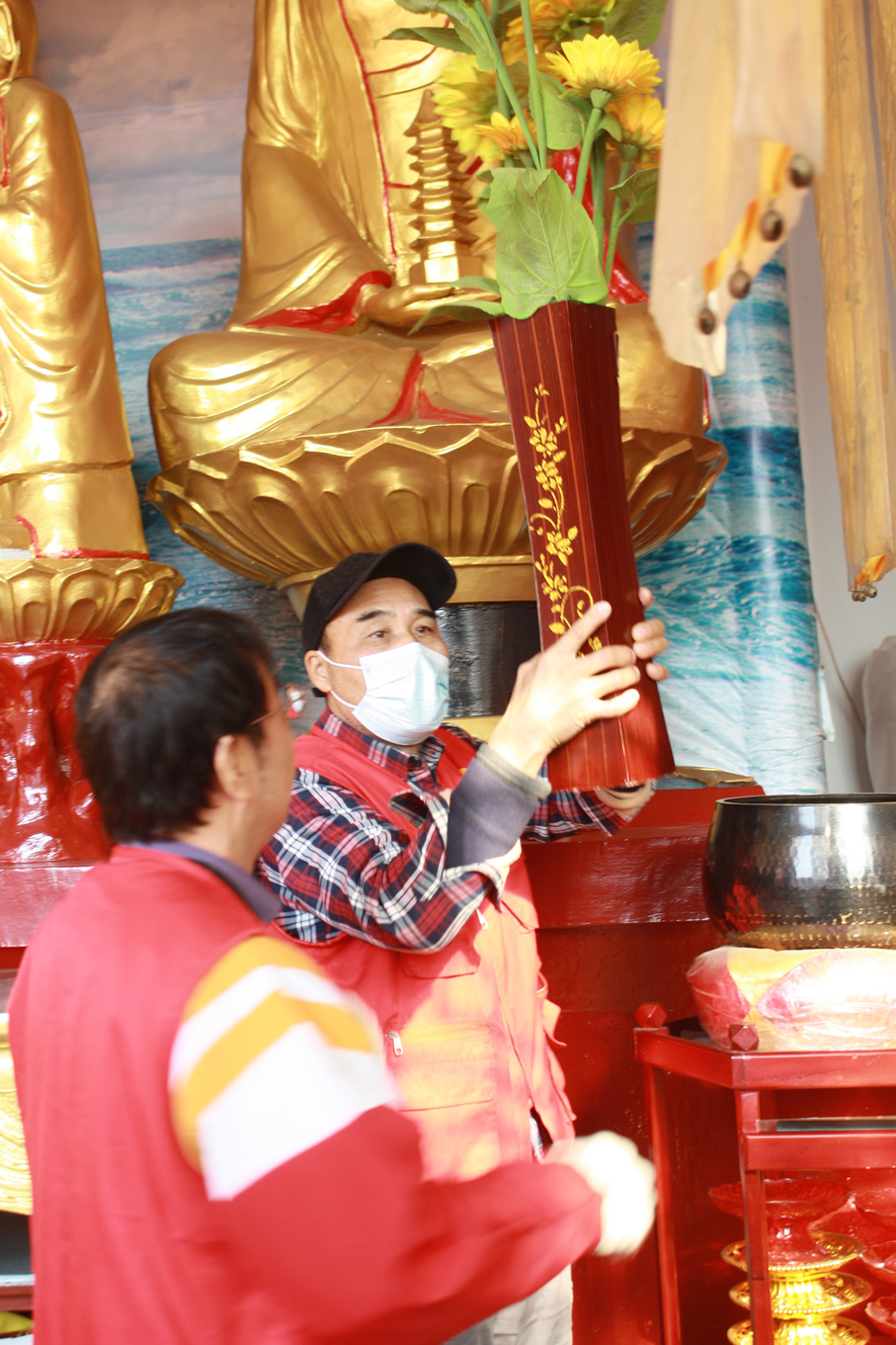一组负责清理大殿,另一组则搭乘四辆电动与油机三轮车,携带电锯和斧头,前往距离寺庙约1公里多的地方,将之前已采集好的树枝柴木,拖回庙内处置。