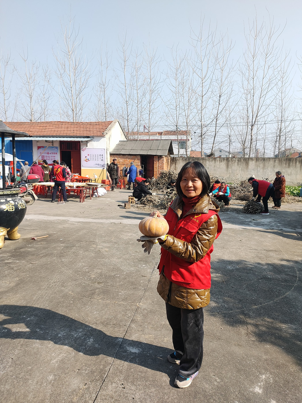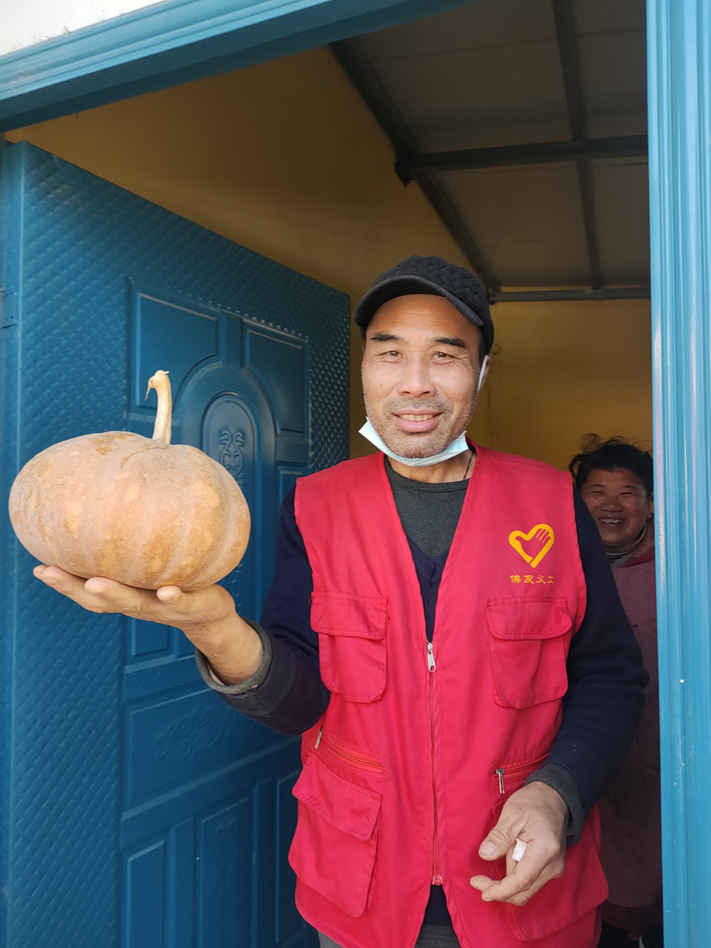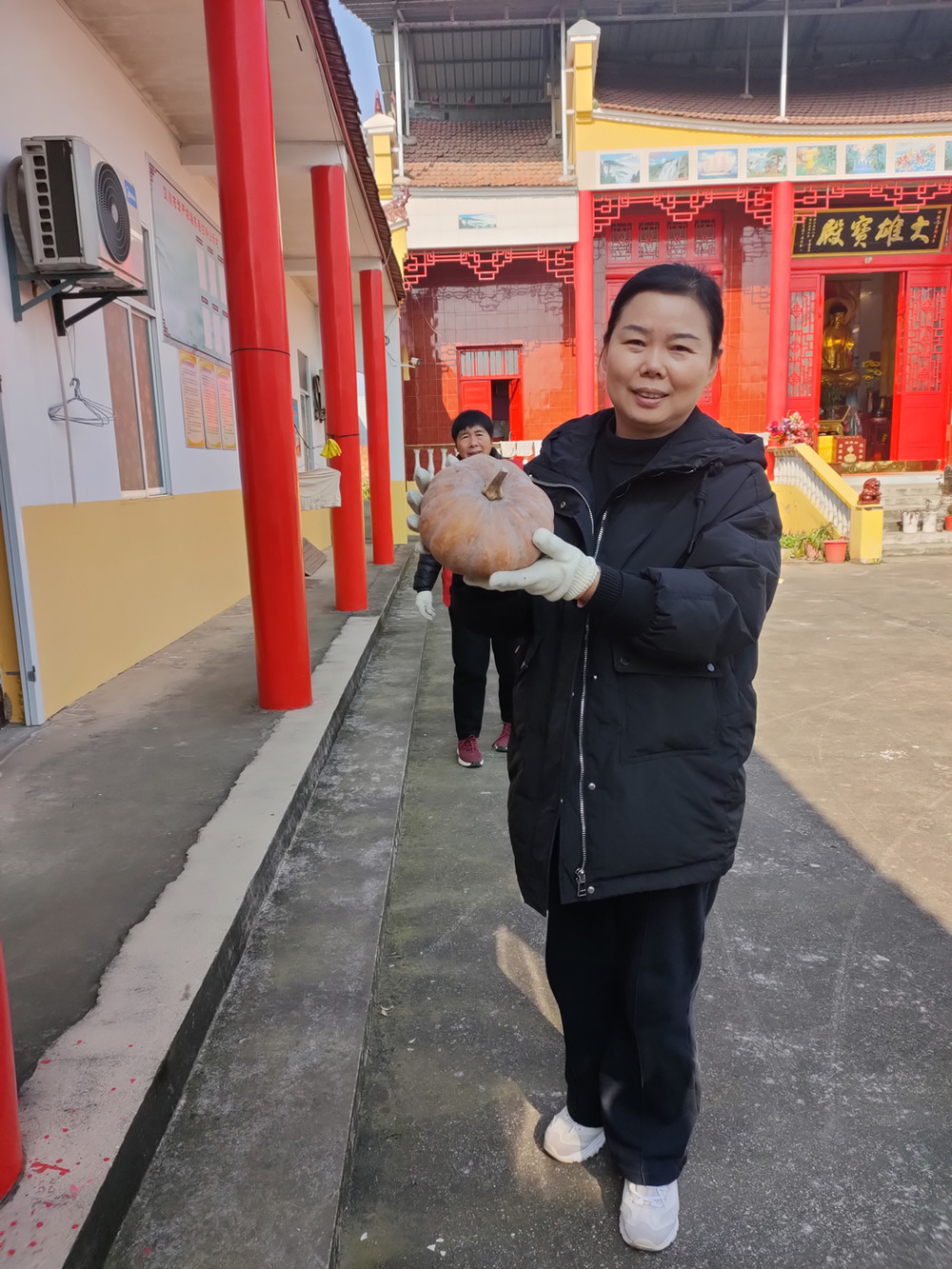 伴随着太阳西下,转眼就到了回程的时候。乐信师兄的手机丢失,成了一个小小的插曲,也牵动了师父和所有人的心弦。当然也如往常一样,我们的活动是圆满,这个小插曲很快就有了好消息,在捡拾树枝的路上找到了。还有令人惊喜和感动的是,师父不仅为我们提供了丰盛的午斋,还给我们备了一大堆白菜、萝卜、藕,还有师兄接受了劝着打包的各种菜品,除此,我还额外拥有一个漂亮的小南瓜,这可真是回父母家的感觉啊,连吃带拿还带送。人生幸福如此,亦何他求?!