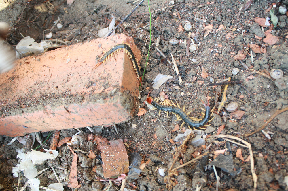 砖堆里藏着许多的蜈蚣,我们不断地将它们翻了出来,然后小心翼翼地帮它搬个家