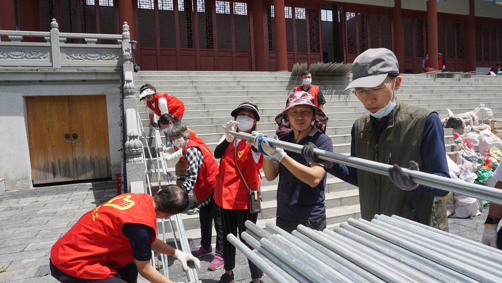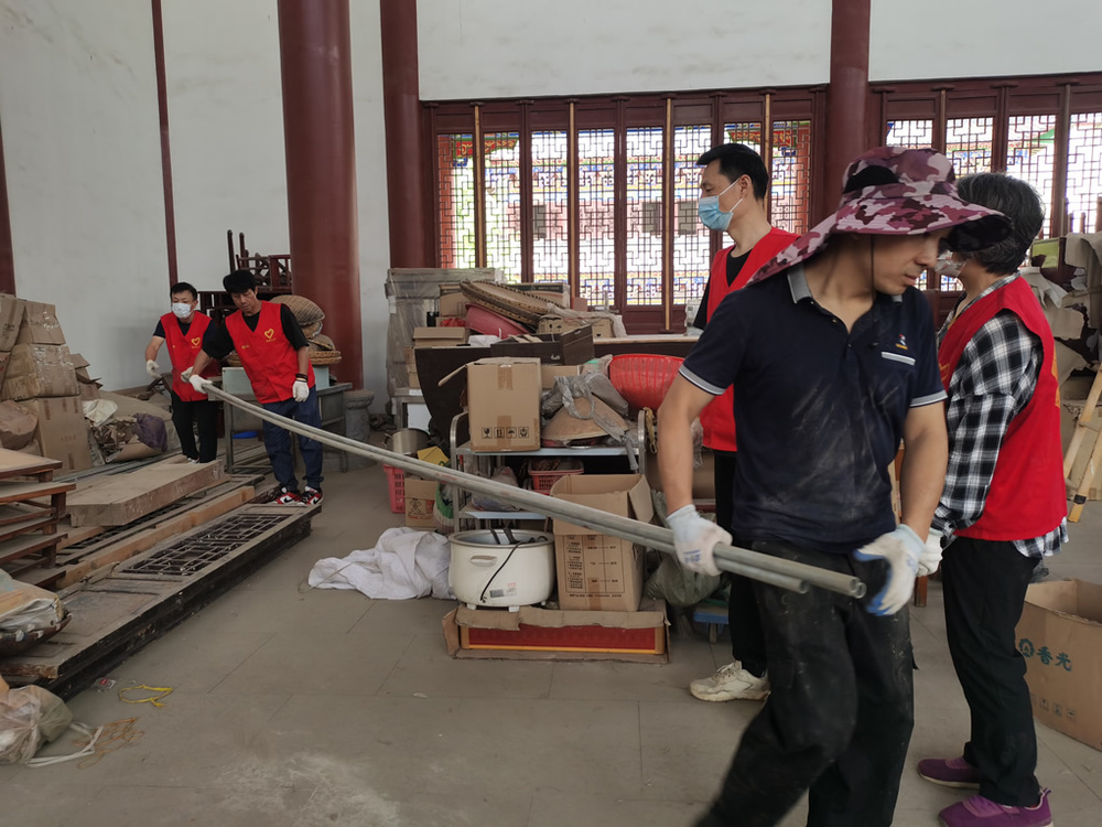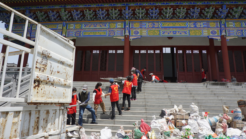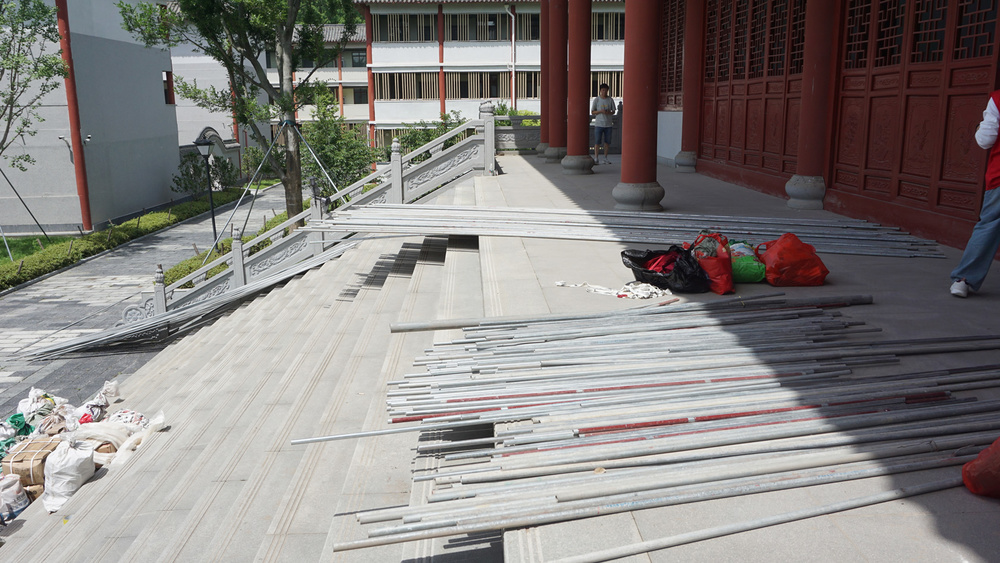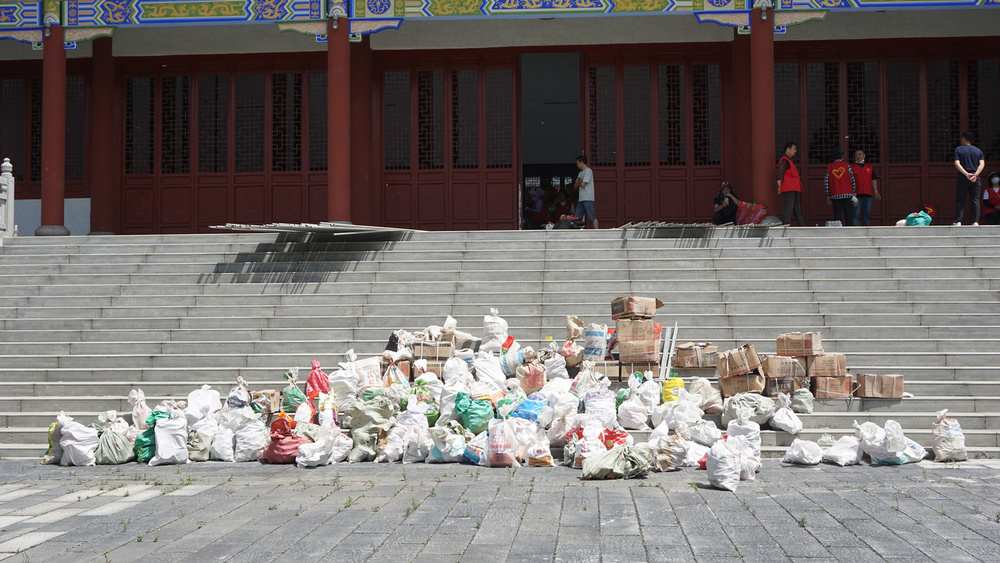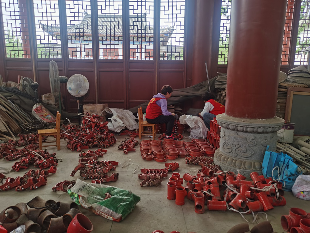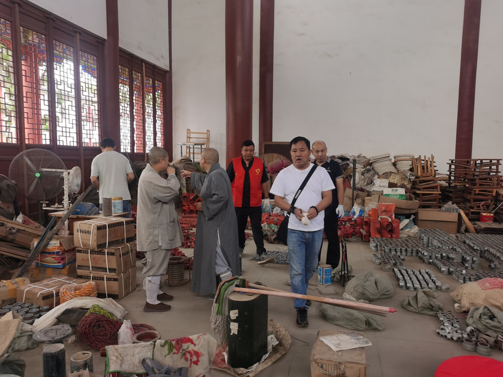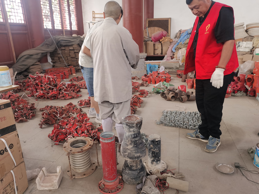 将寺院建设时期遗留下来的很多渡锌水管、弯头、夹管等等约2吨多重的消防器材
