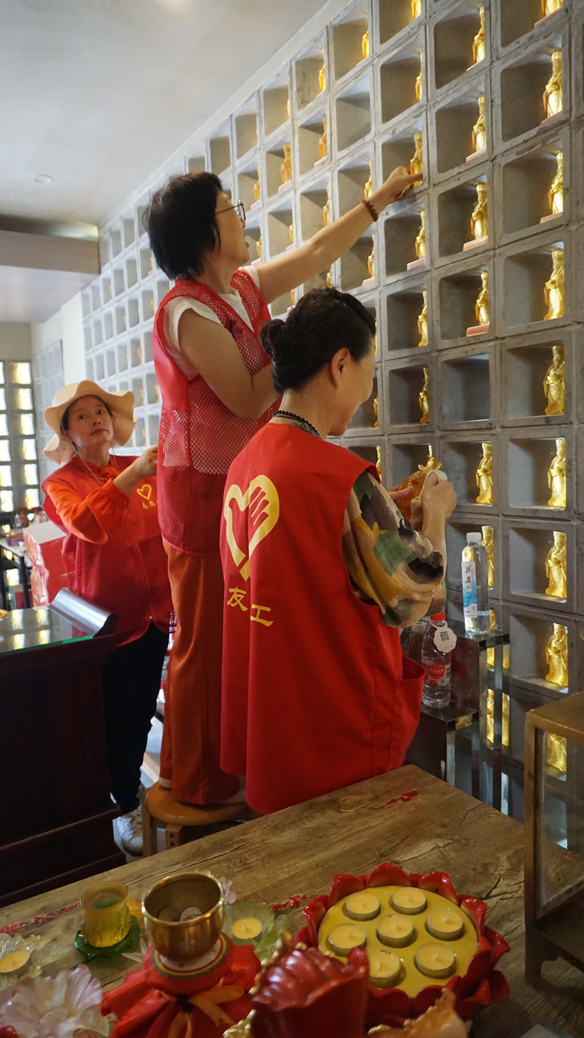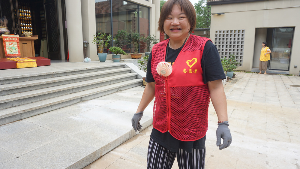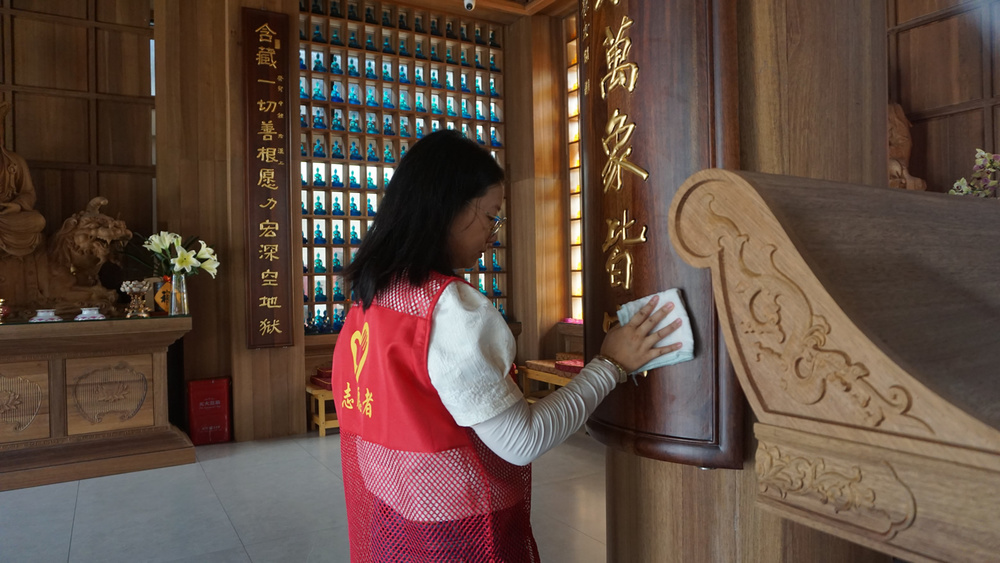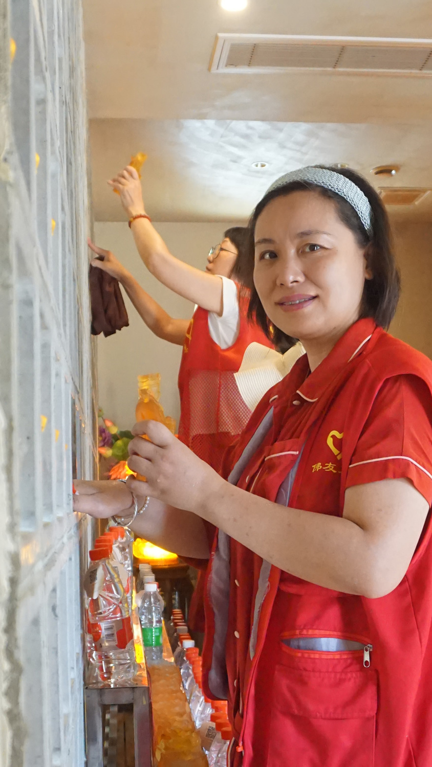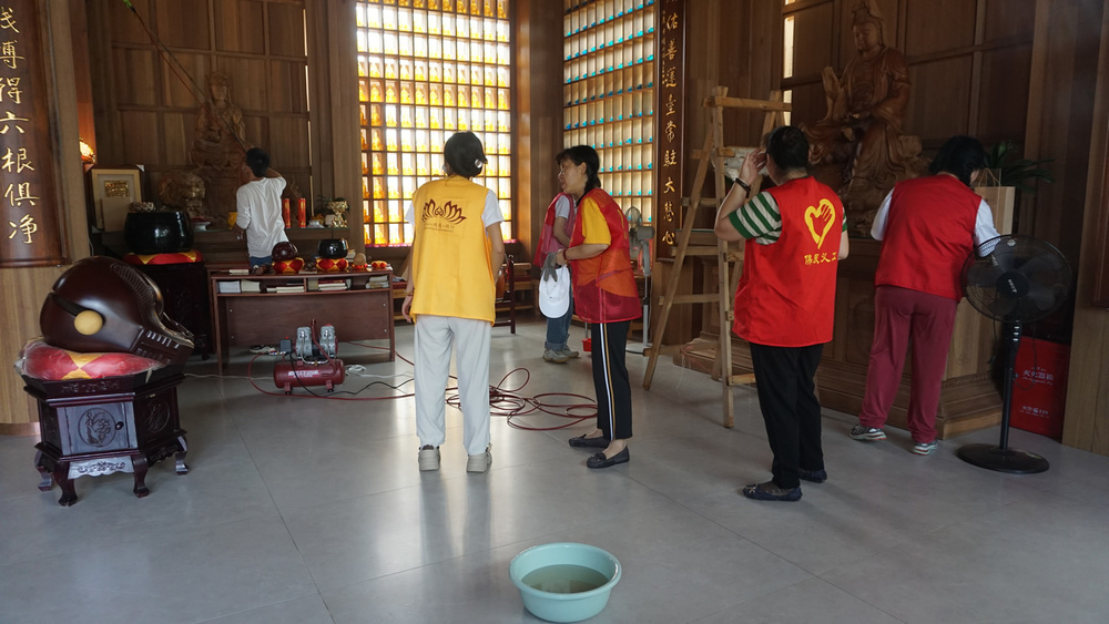参加大殿清扫小组的,有不少都是第一来参加义工活动的义工,我也有些特意安排她们来打扫大殿,一则相对室外搬运之活没那么累与晒,二则在大殿做事清洁佛像等,更能体味到我们佛友义工的特征。