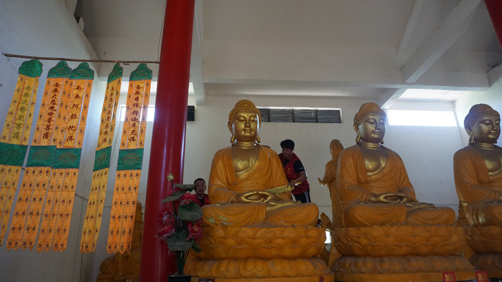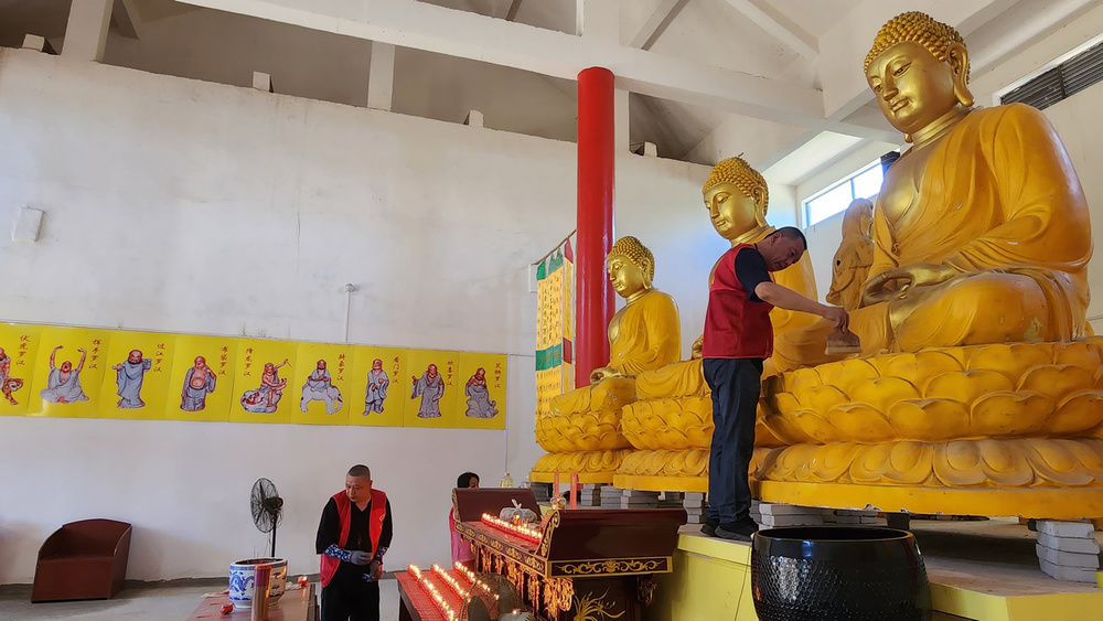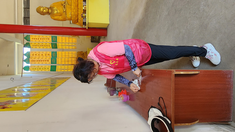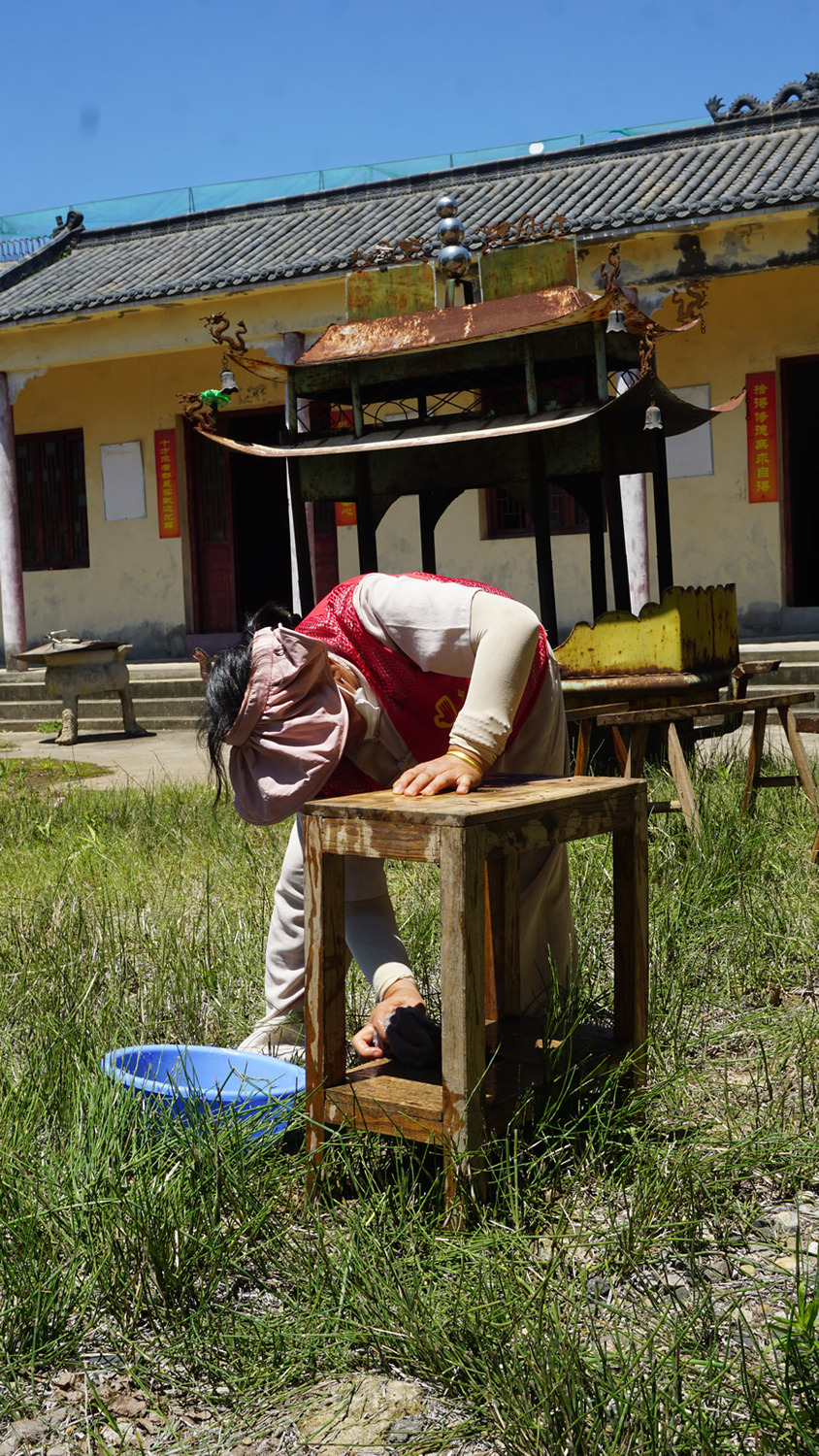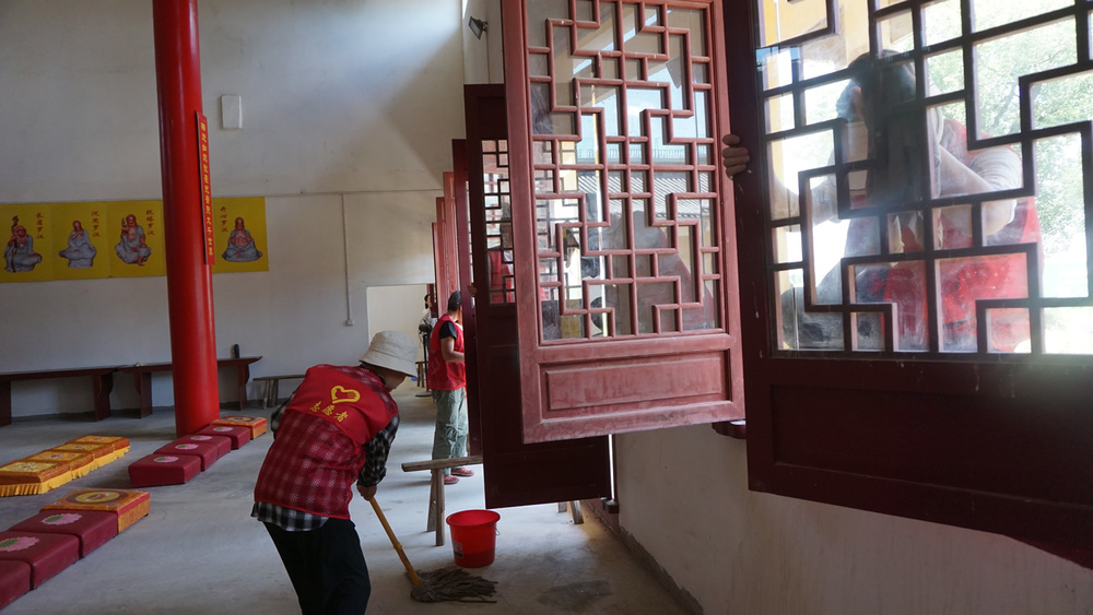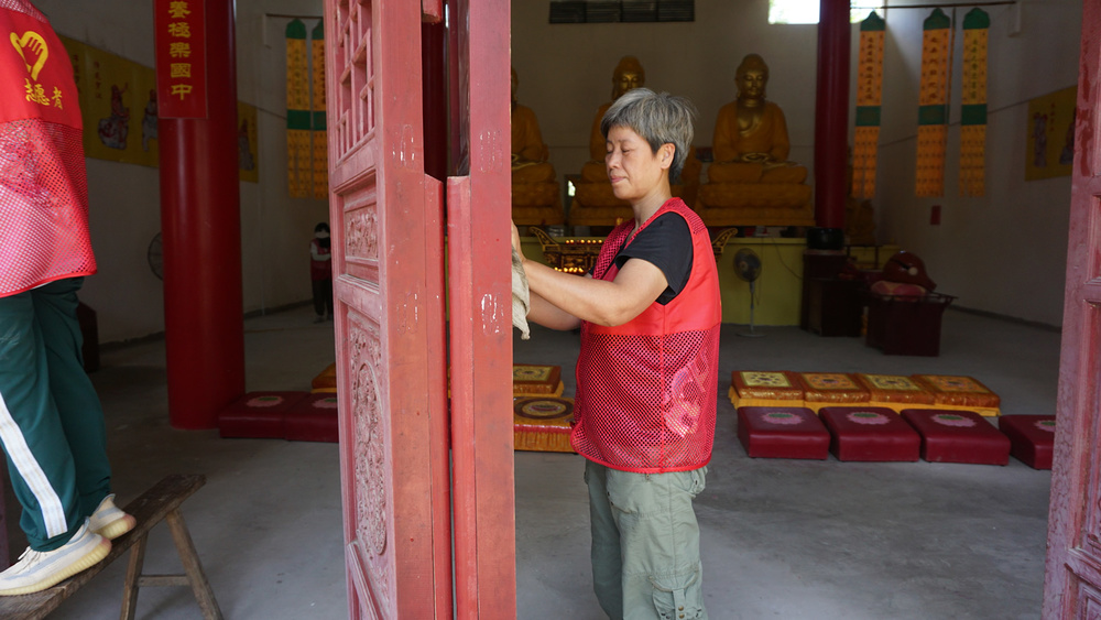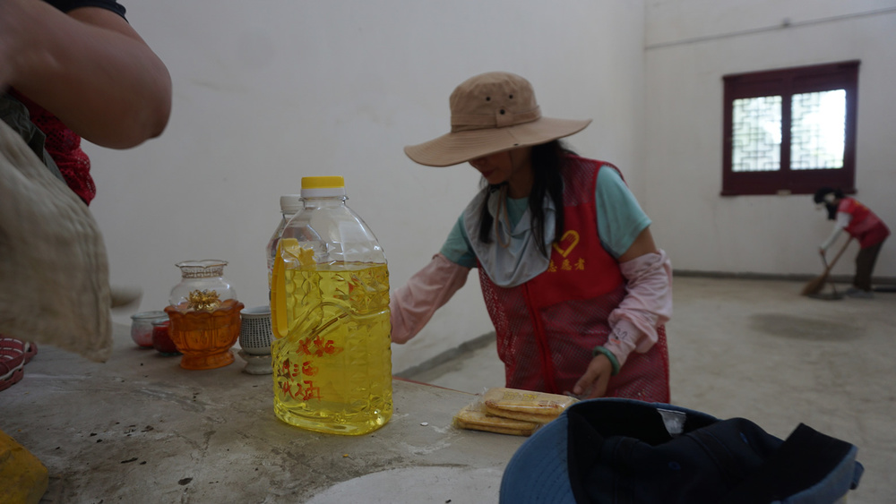 师父带大众捻香、上供后、上午的劳动暂告一段落