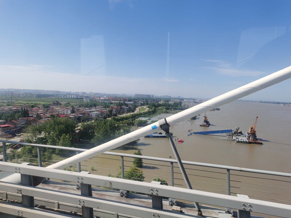 长江当前已在处在大洪水水位,过了大桥我们就到达黄州地界的啦