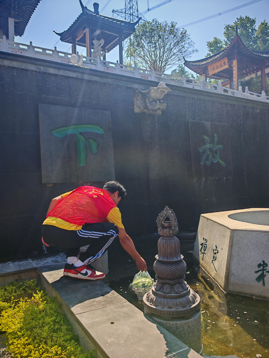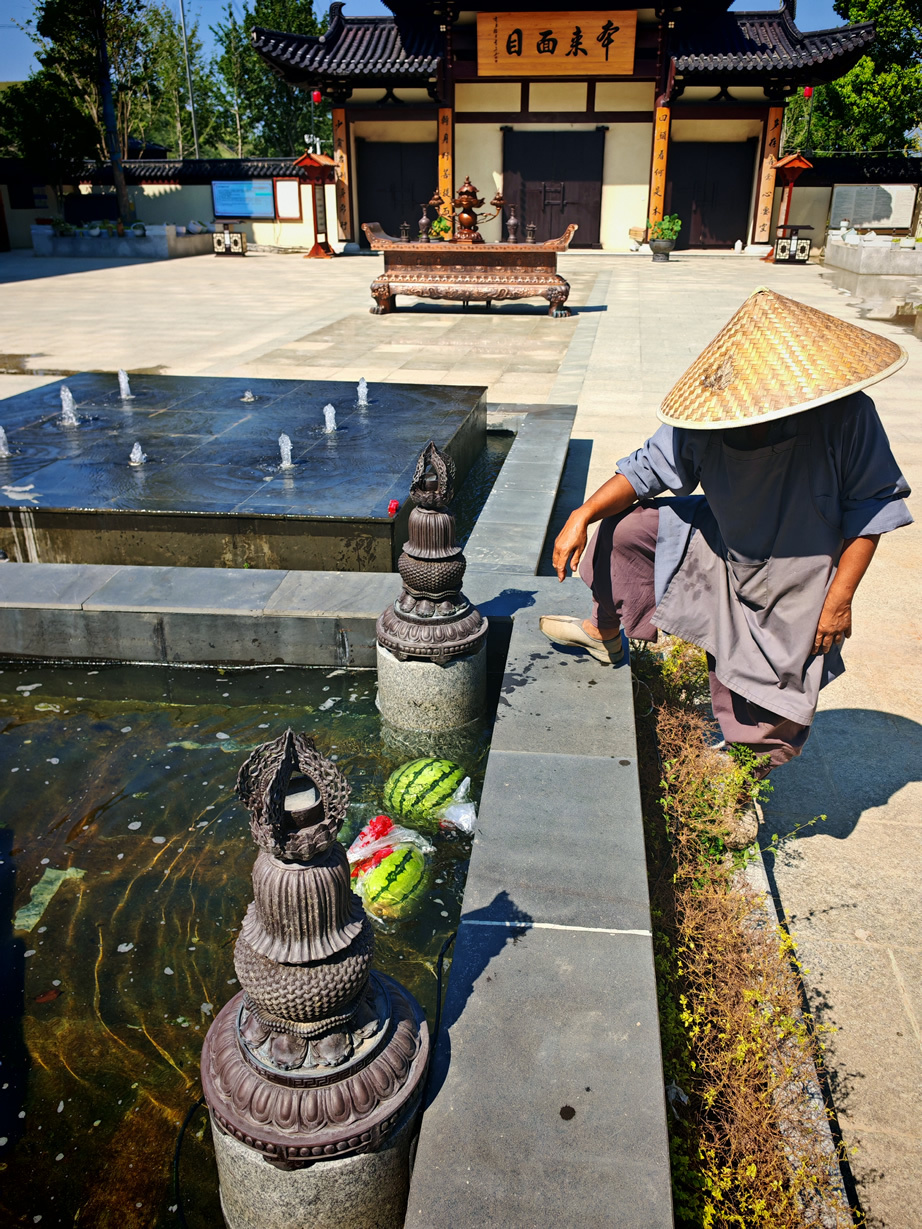 由于西瓜太大,不方便放置冰箱之中,我们一到达白龙寺后,即选择方便将西瓜先置于入寺广场的放下水池之上