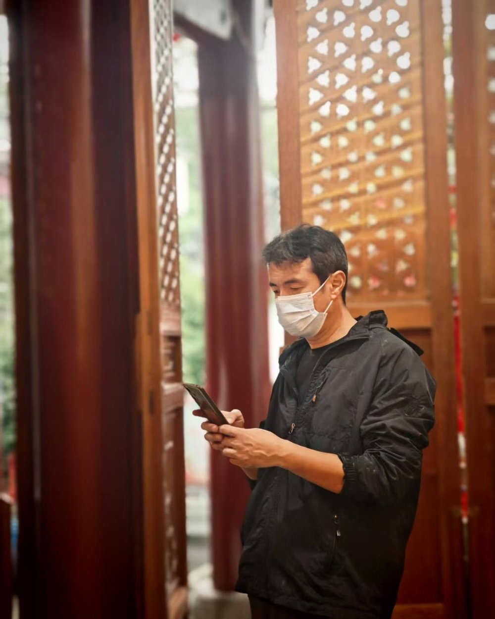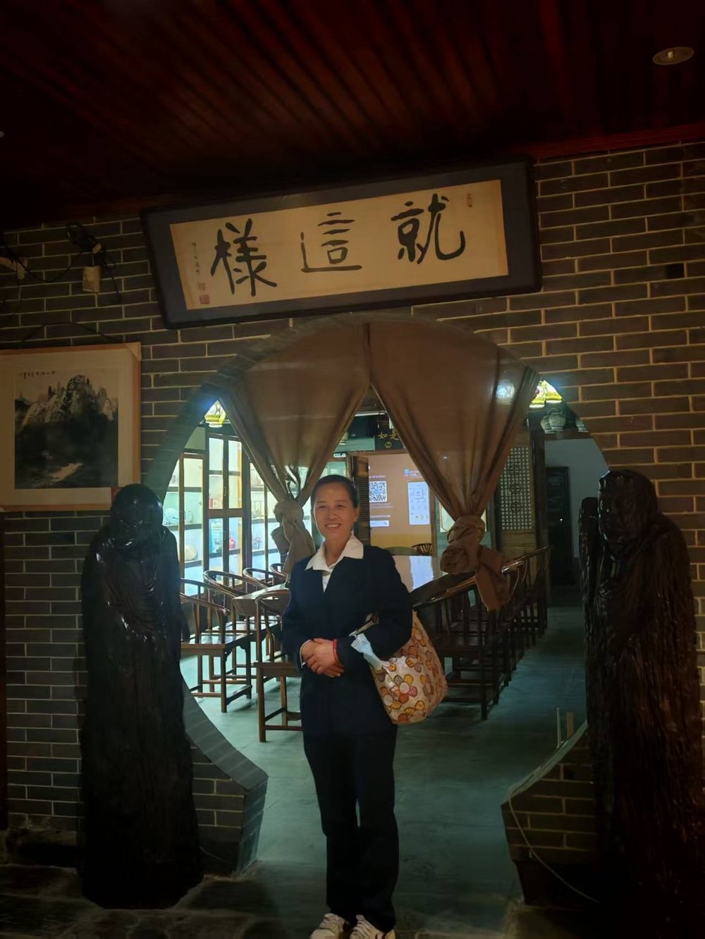 流浪的云师兄下午还有工作需要提前离开,带她去了一下寺院一侧的七宝茶室,有许多珍贵的雕像、字画,当然还有茶,在供奉着一部大藏经的书柜前留了一张影