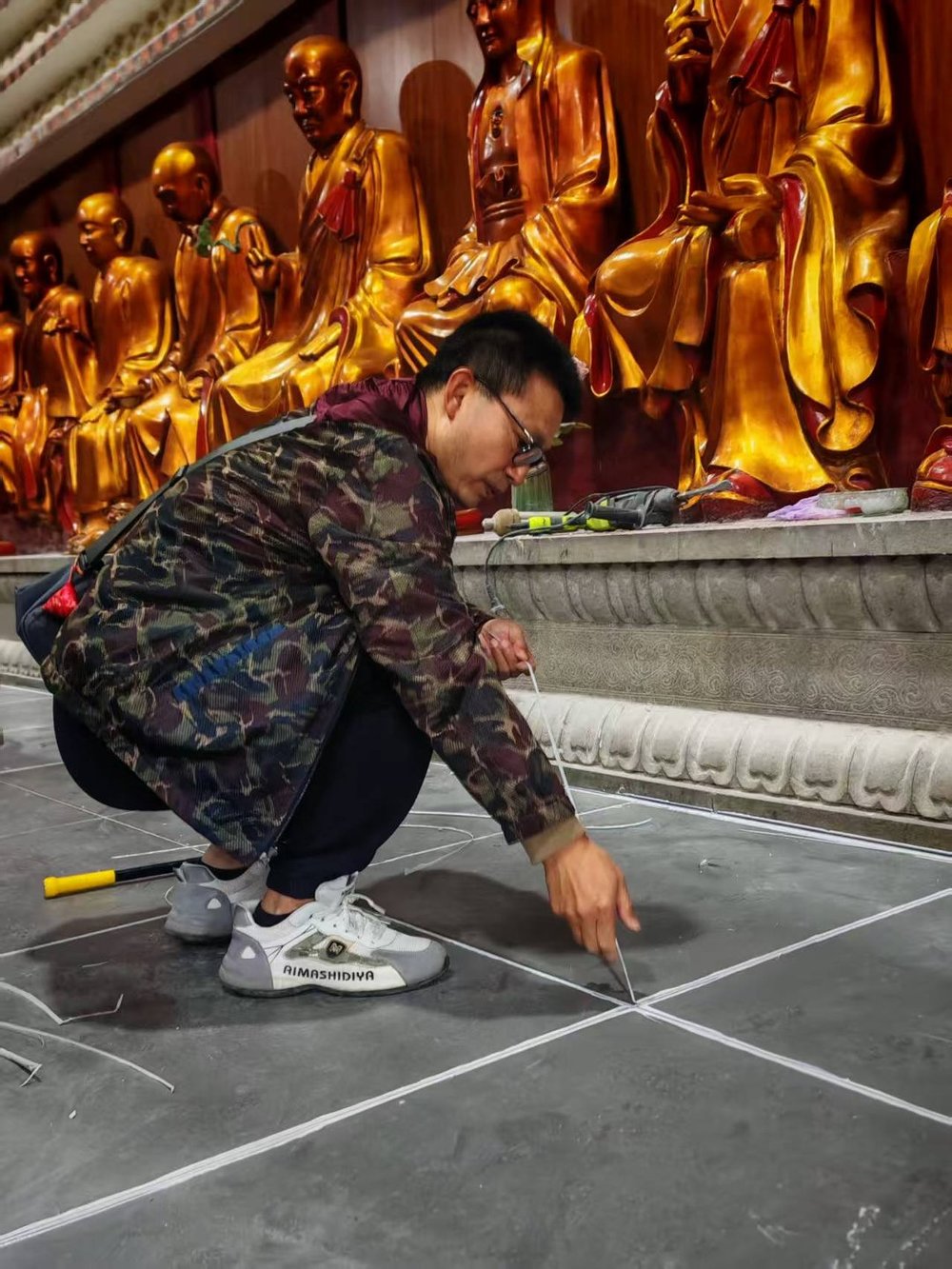 座台是滴落了许多油漆点点需要铲除,大殿地面地砖的拼缝胶条都还未清除,...