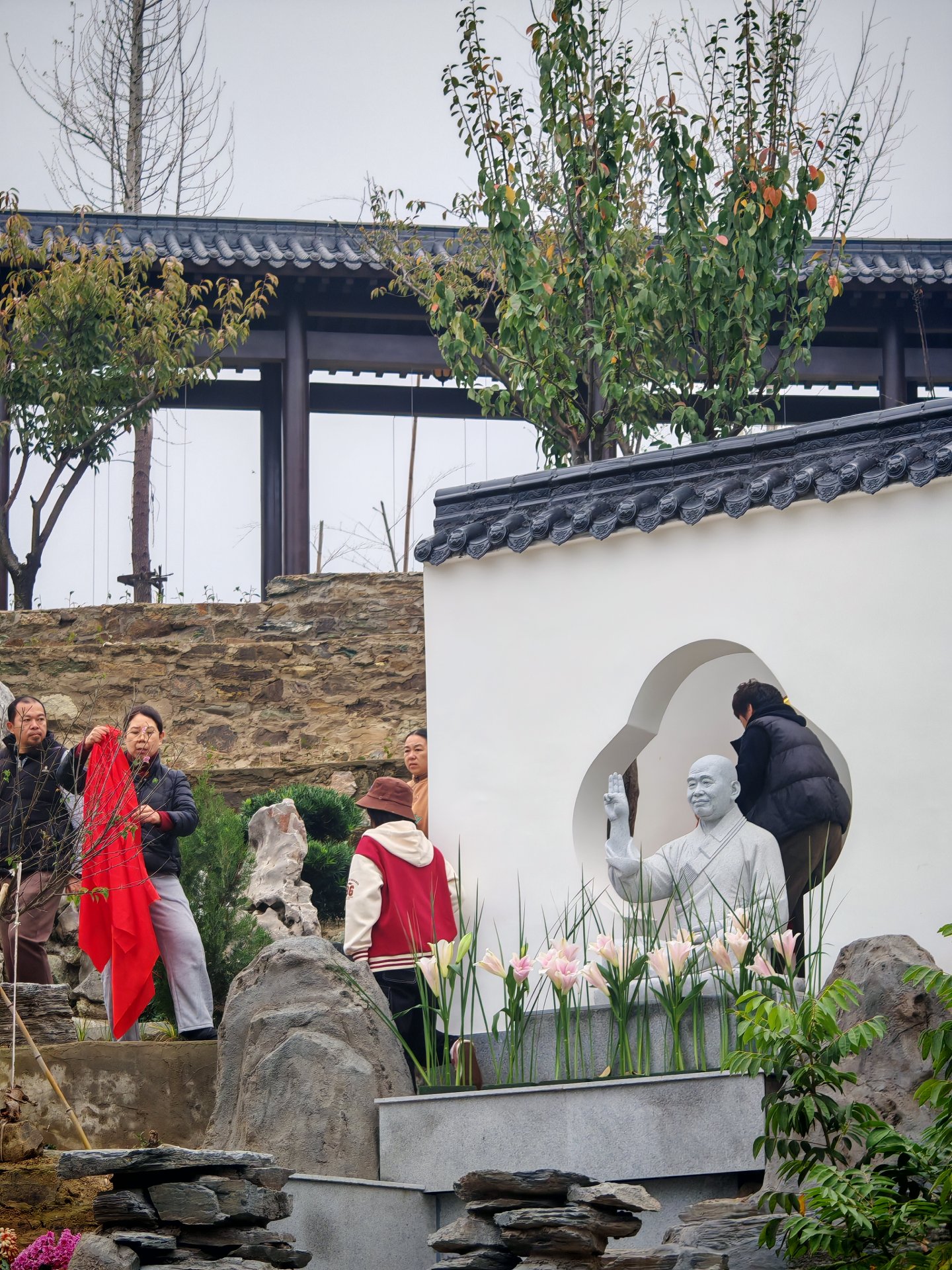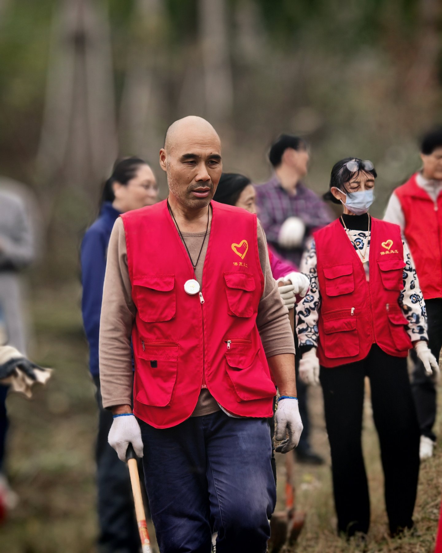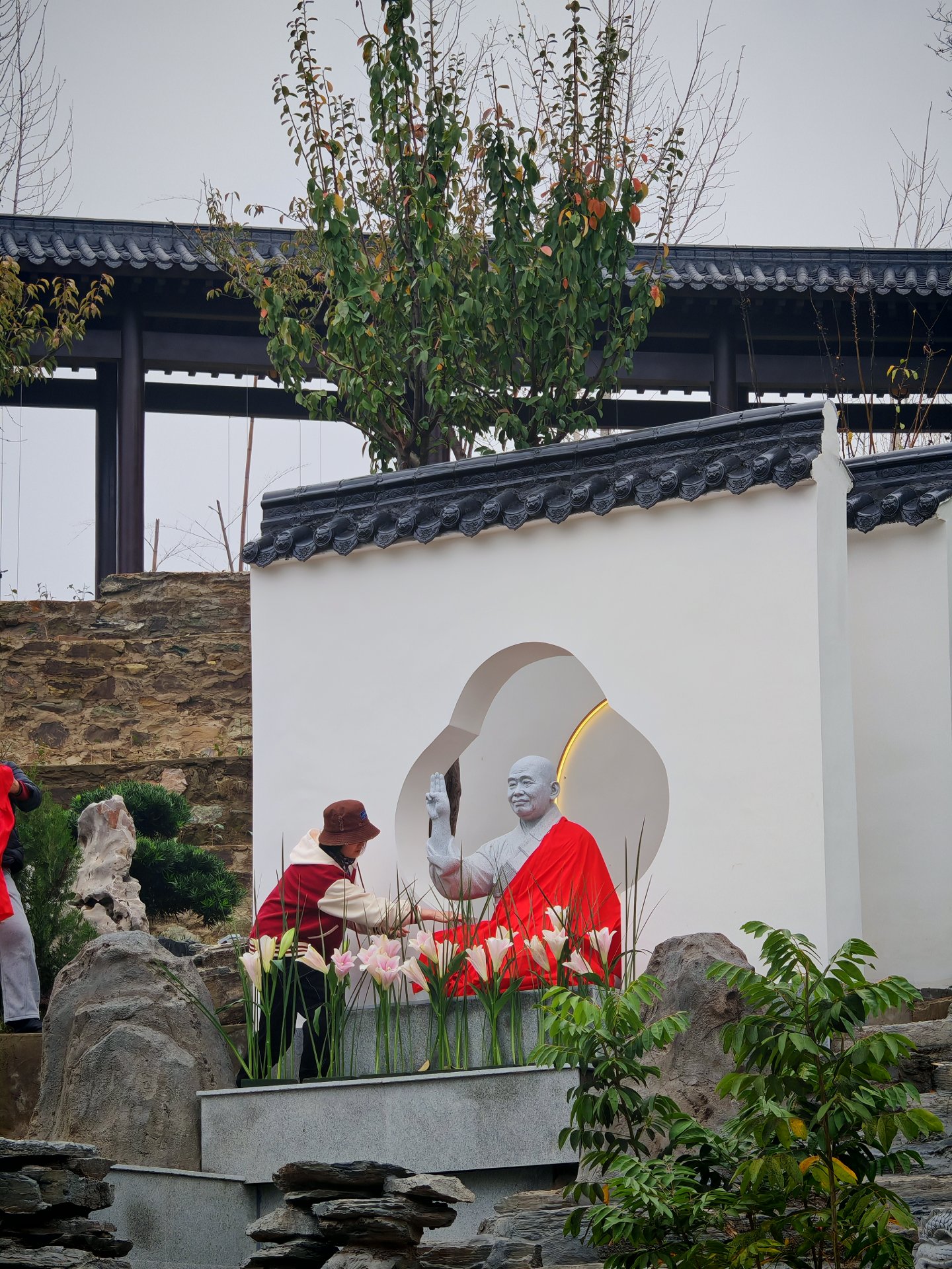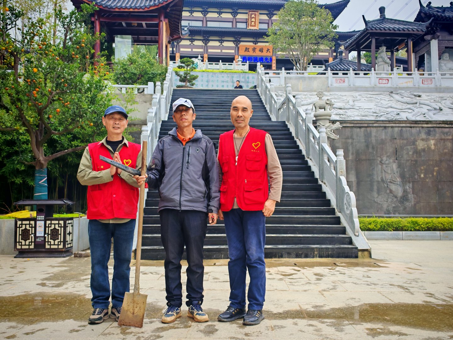 闷头一人干活维护寺院的绿植,午斋吃饭时我叫他,他也不肯停下说是不饿,拍大合影时未有见到他,拍完了遇到了于是再合影一张