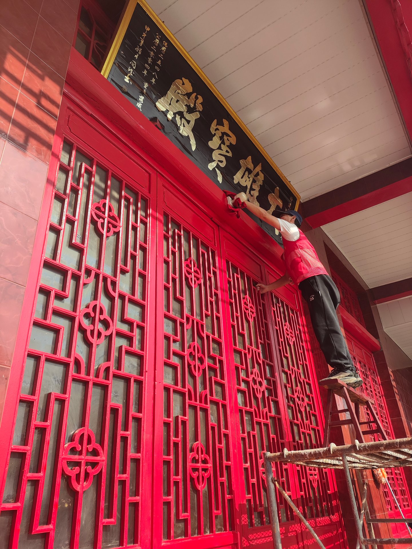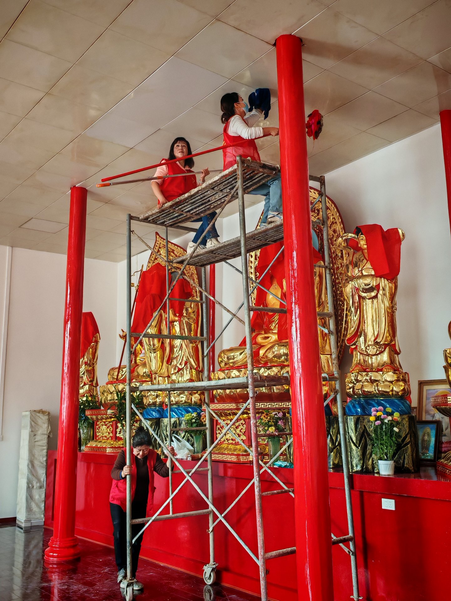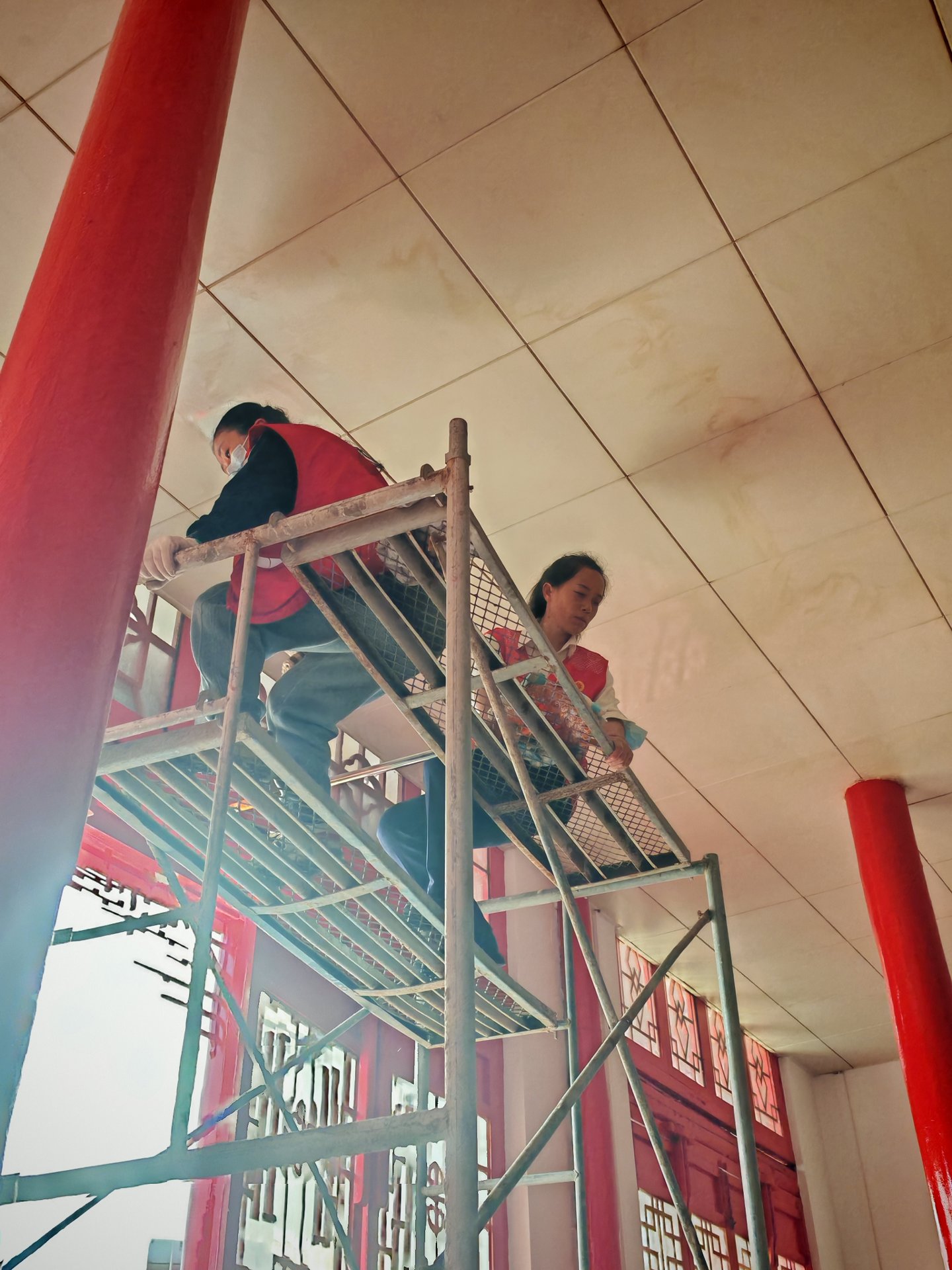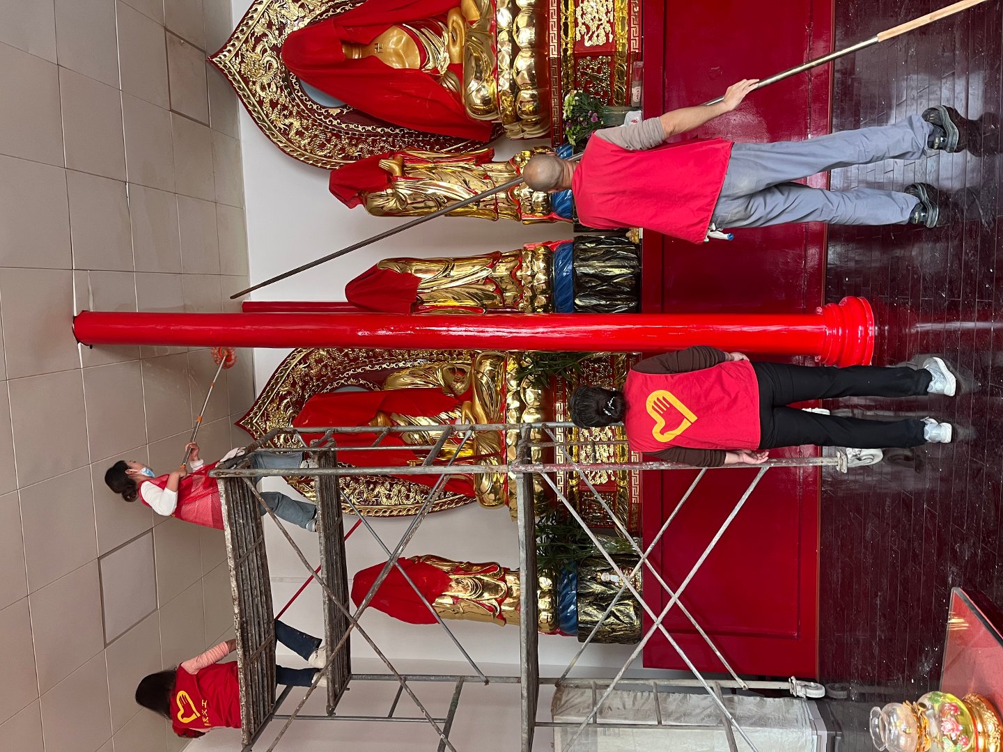 下午我们搭了高架,主要做大殿天花板吊顶的清洁,吊顶用的铝扣板,常年被下面香烛燃染表面一层油污清析可见