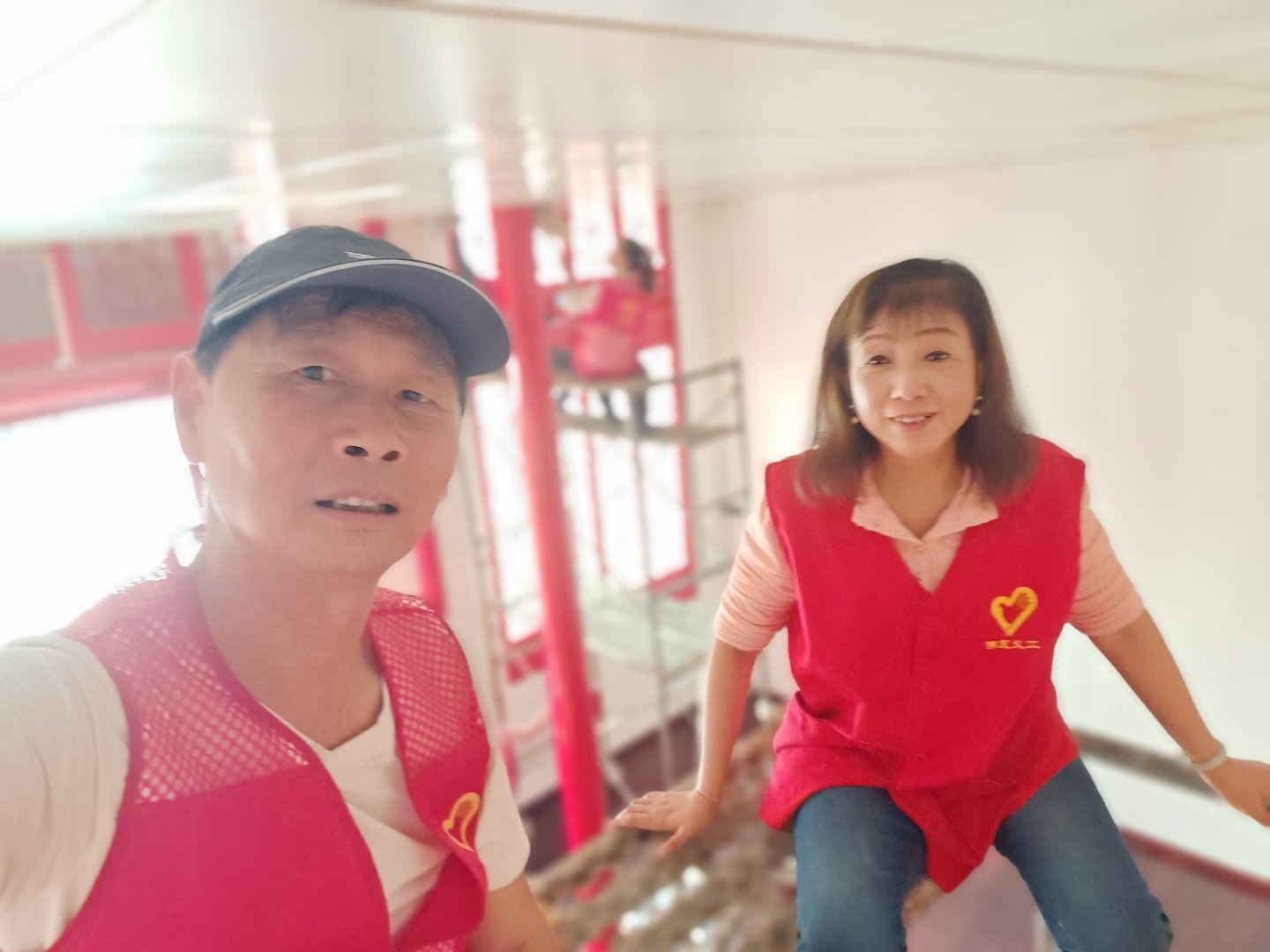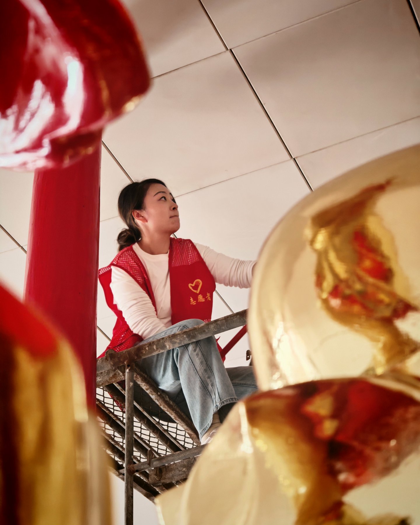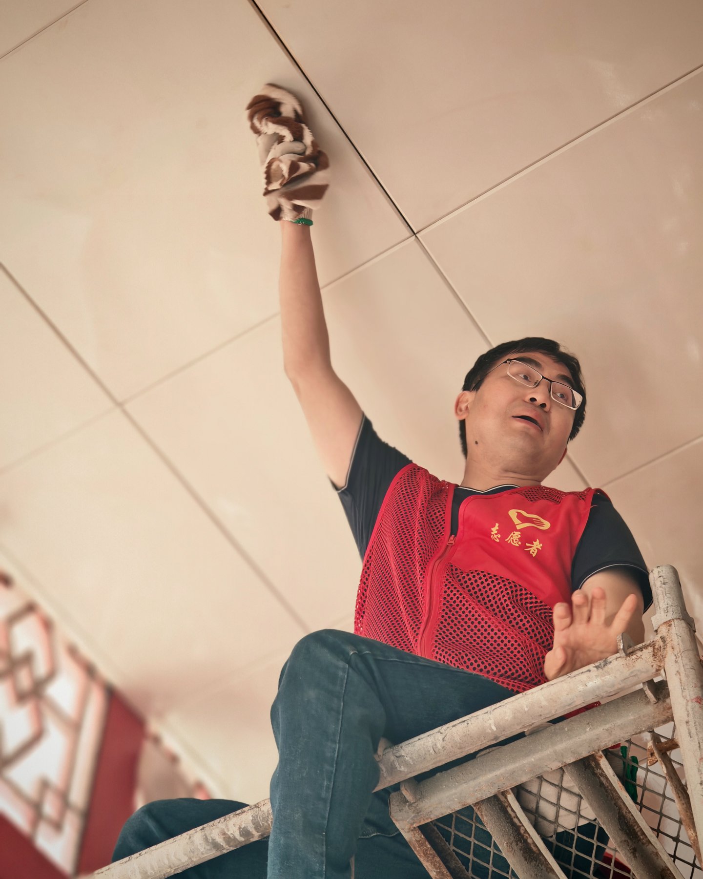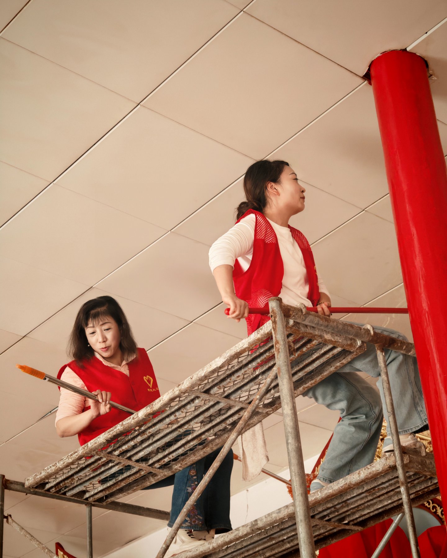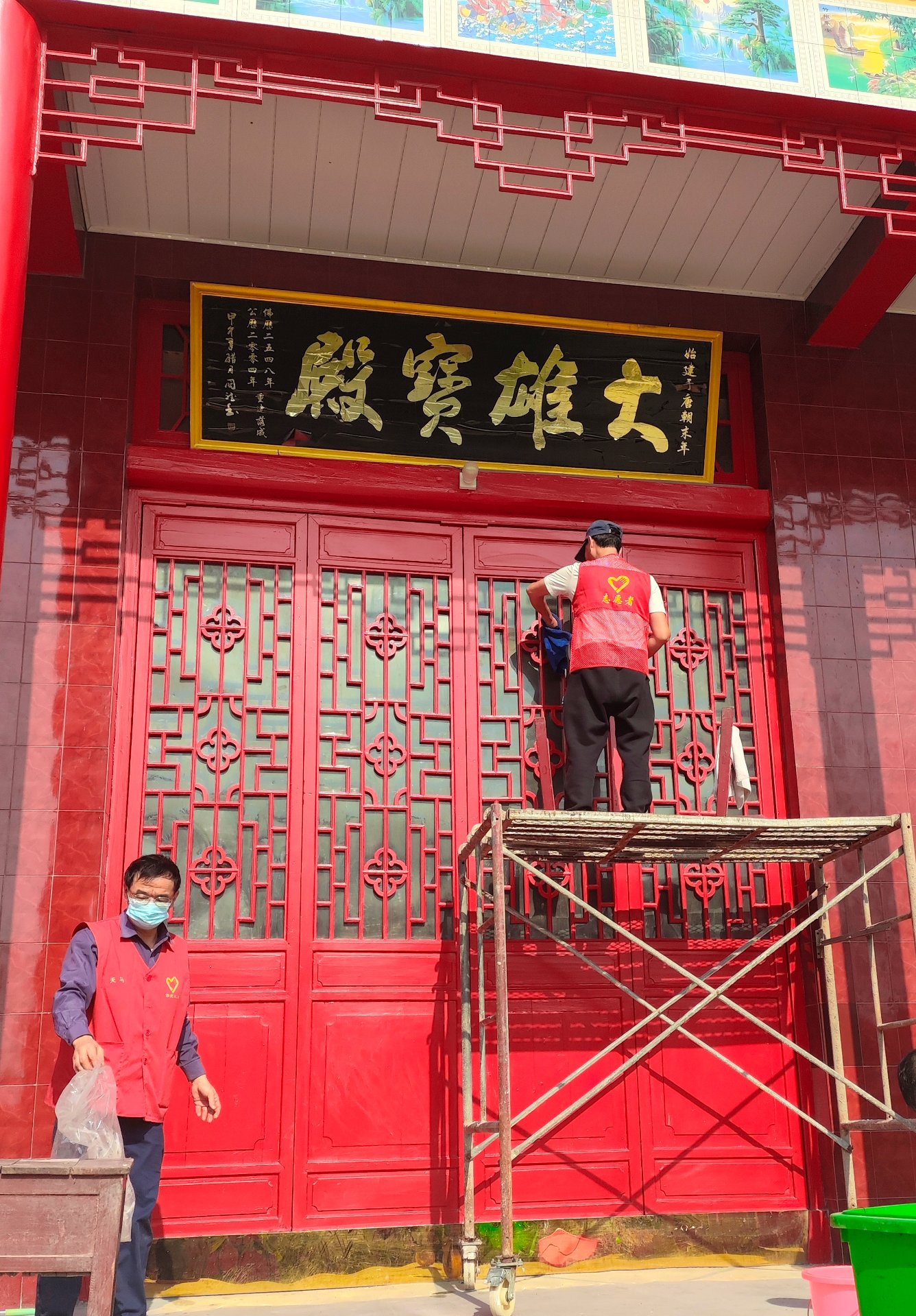 下午我们搭了高架,主要做大殿天花板吊顶的清洁,吊顶用的铝扣板,常年被下面香烛燃染表面一层油污清析可见