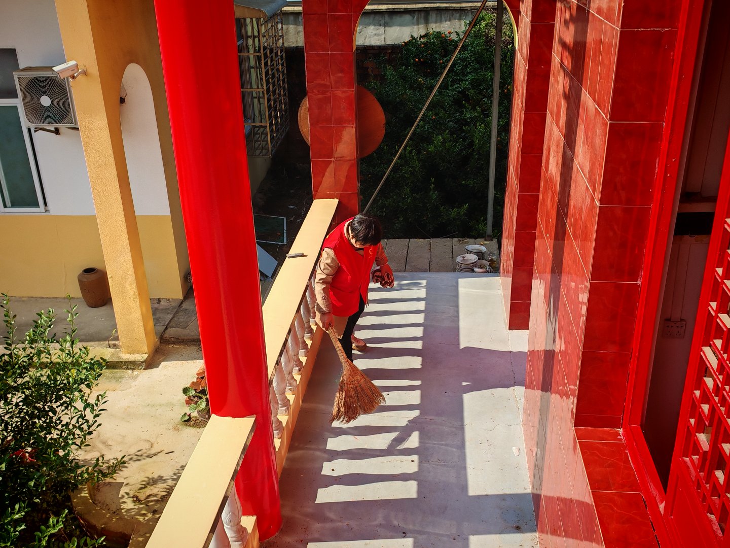 阳光下,寺院中,师兄们都在用心做事并无烦恼在身
