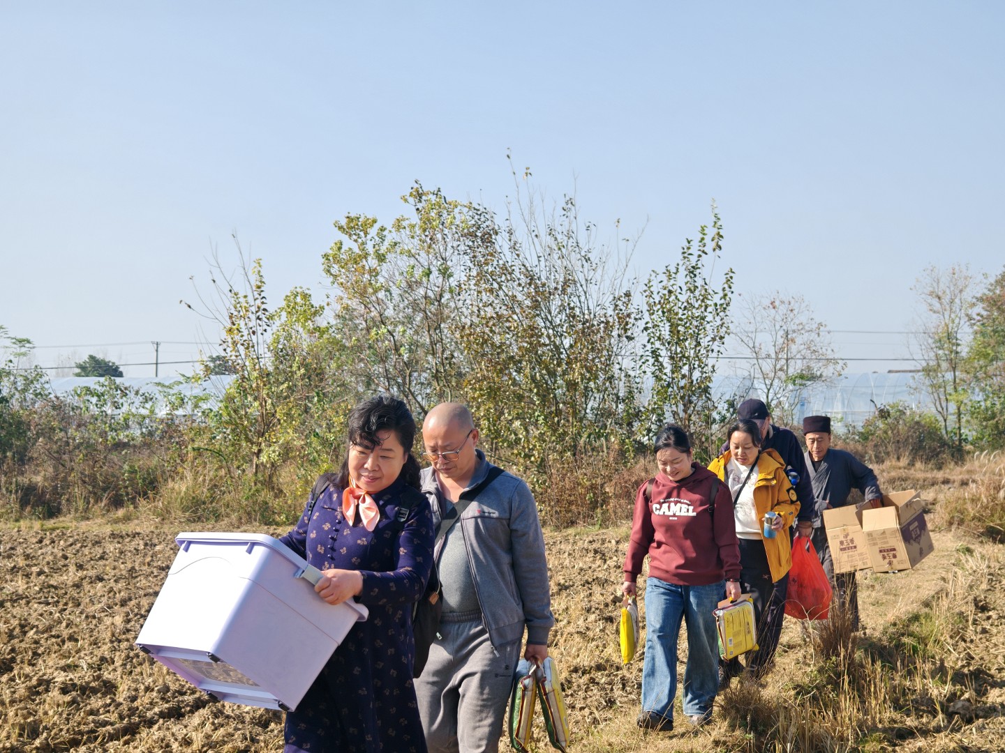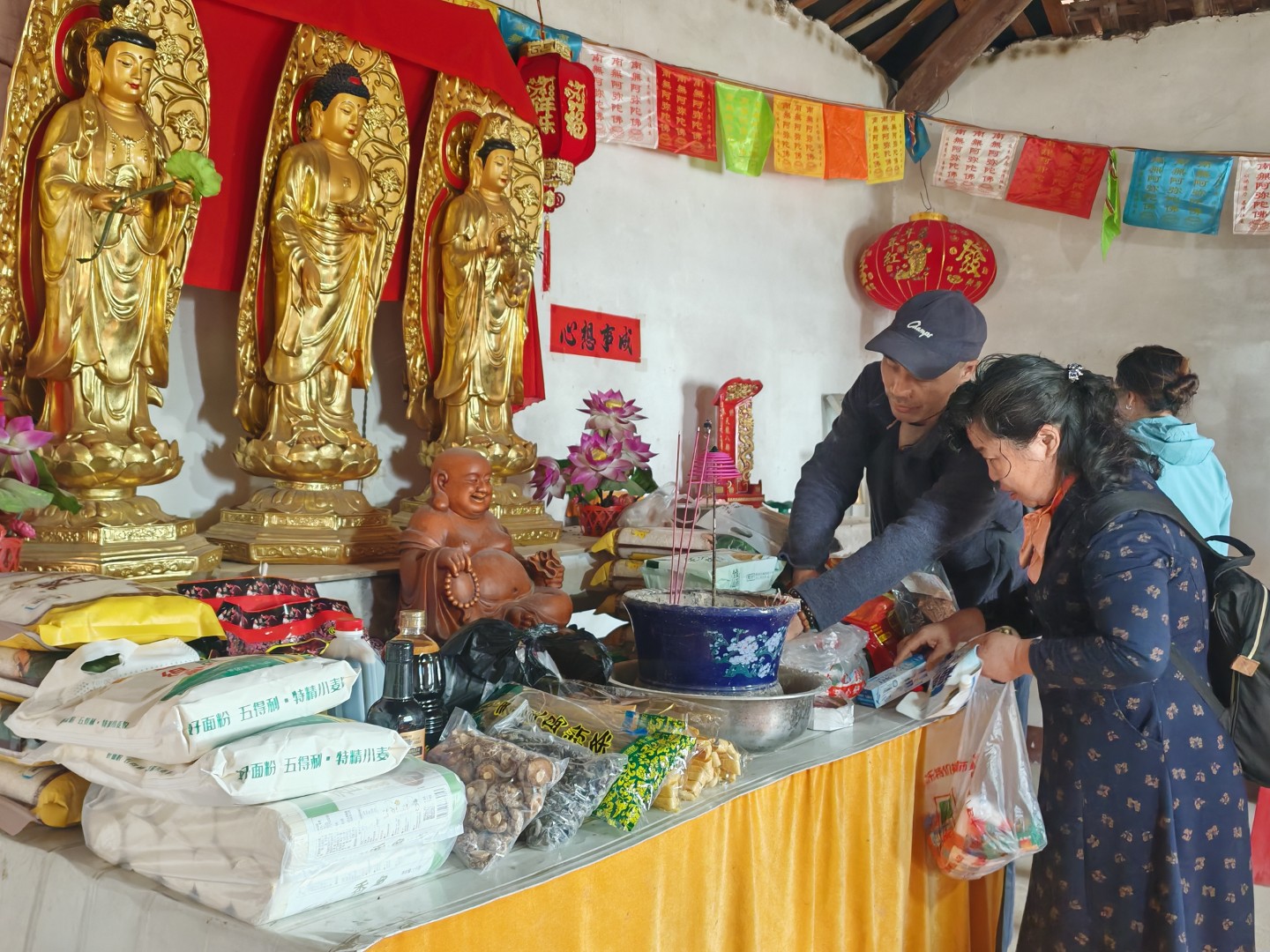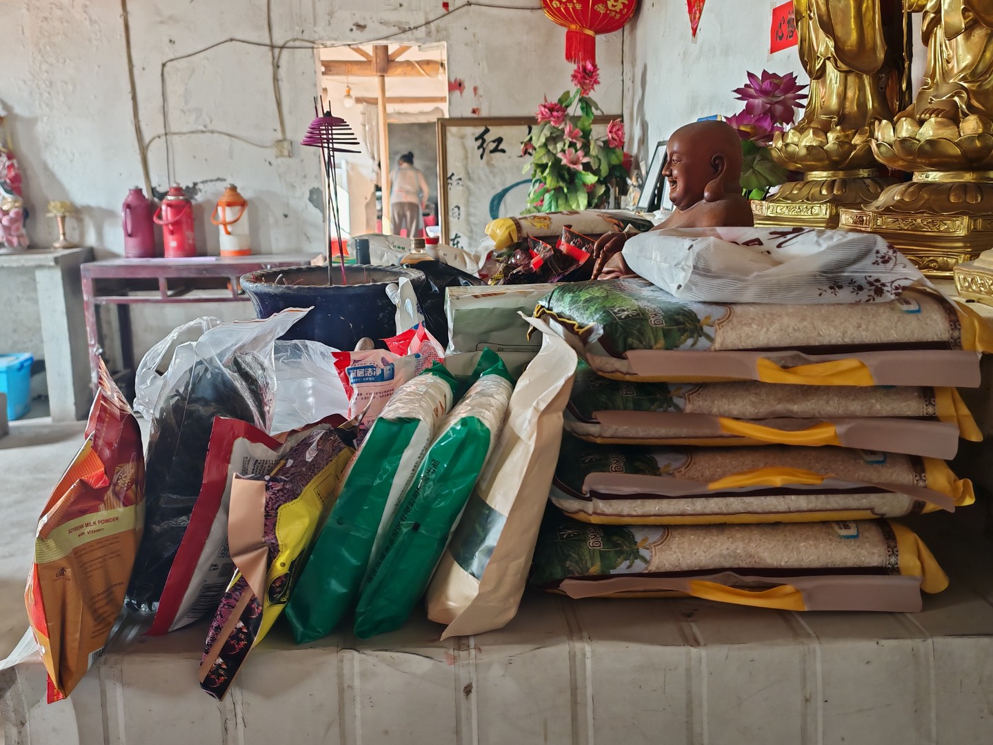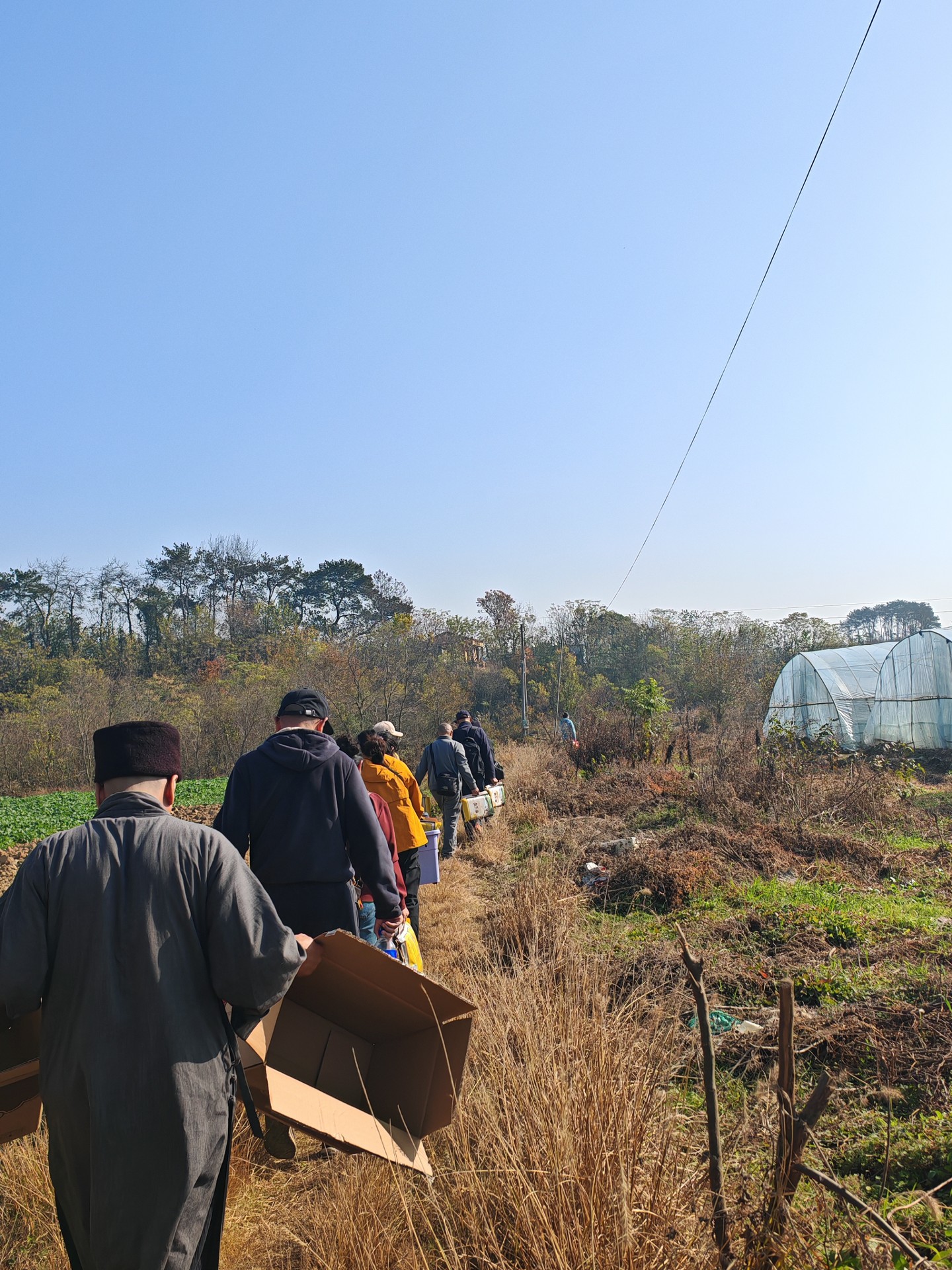 师父收到我们要前来的信息后,起到寺院外的村里大路上接到了我们,一如往年那般,大家搬着物资从田埂上走过,去到了寺院