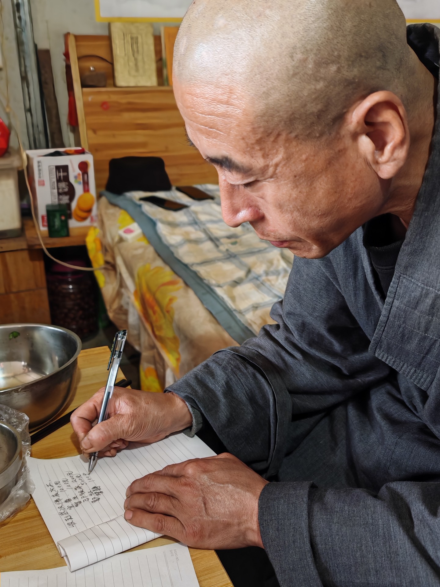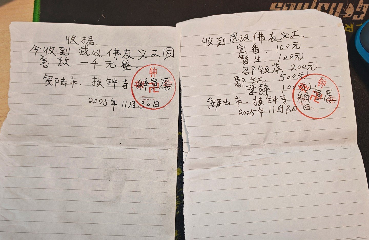 师父很正式地找出纸笔,慢慢地一笔一划地写下了这两张收据,临别时还领众在佛前做了回向