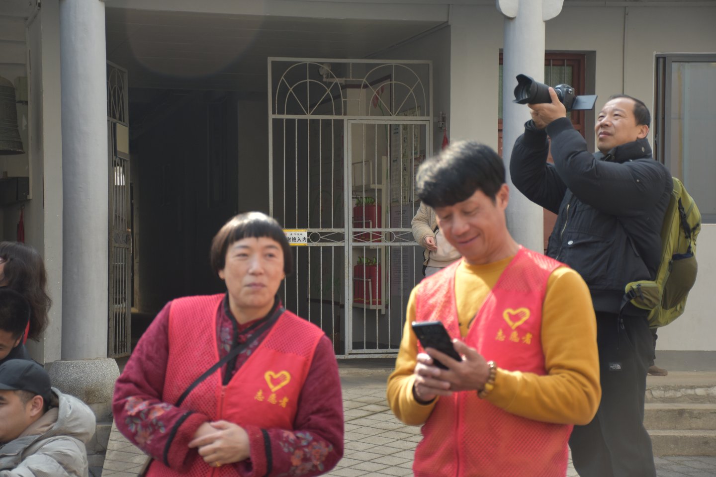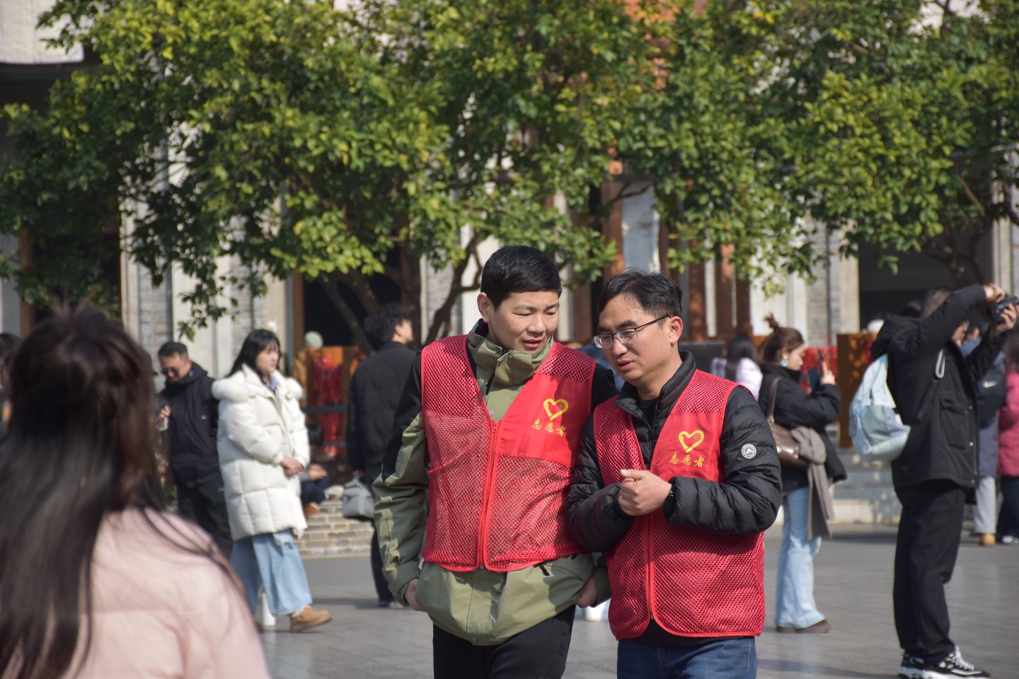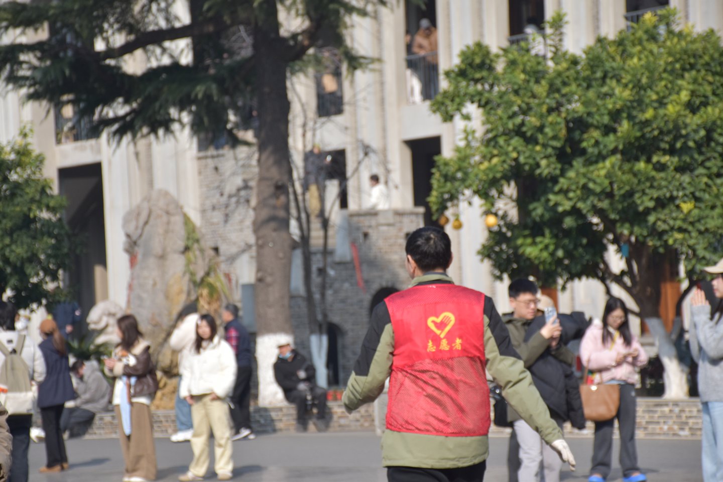 在游客如织之中我们的义工师兄是那么的显目与正态